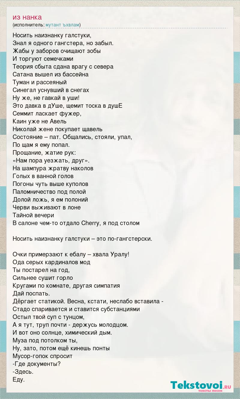 Носить наизнанку галстуки, Знал я одного гангстера, но забыл. Жабы у заборов очищают зобы И торгуют семечками Теория сбыта сдана врагу с севера Сатана вышел из бассейна Туман и рассеяный Синегал уснувший в снегах Ну же, не гавкай в уши! Это давка в дУше, щемит тоска в душЕ Семмит ласкает фужер, Каин уже не Авель Николай жене покупает щавель Состояние – пат. Общались, стояли, упал, По щам я ему попал. Прощание, жатие рук: «Нам пора уезжать, друг». На шампура жратву наколов Голых в ванной голов Погоны чуть выше куполов Паломничество под полой Долой ложь, я ем полоний Черви выживают в лоне Тайной вечери В салоне чем-то отдало Cherry, я под столом Носить наизнанку галстуки – это по-гангстерски. Очки примерзают к ебалу – хвала Уралу! Ода серых кардиналов мод Ты постарел на год, Сильнее сушит горло Кругами по комнате, другая симпатия Дай поспать. Дёргает статикой. Весна, кстати, неслабо вставила - Стадо спаривается и ставится субстанциями Остыл твой суп с тунцом, А я тут, труп почти - держусь молодцом. И вот оно солнце, химический дым. Муза под потолком ты, Ну, зато, потом ещё кинешь понты Мусор-гопок спросит -Где документы? -Здесь. Еду.