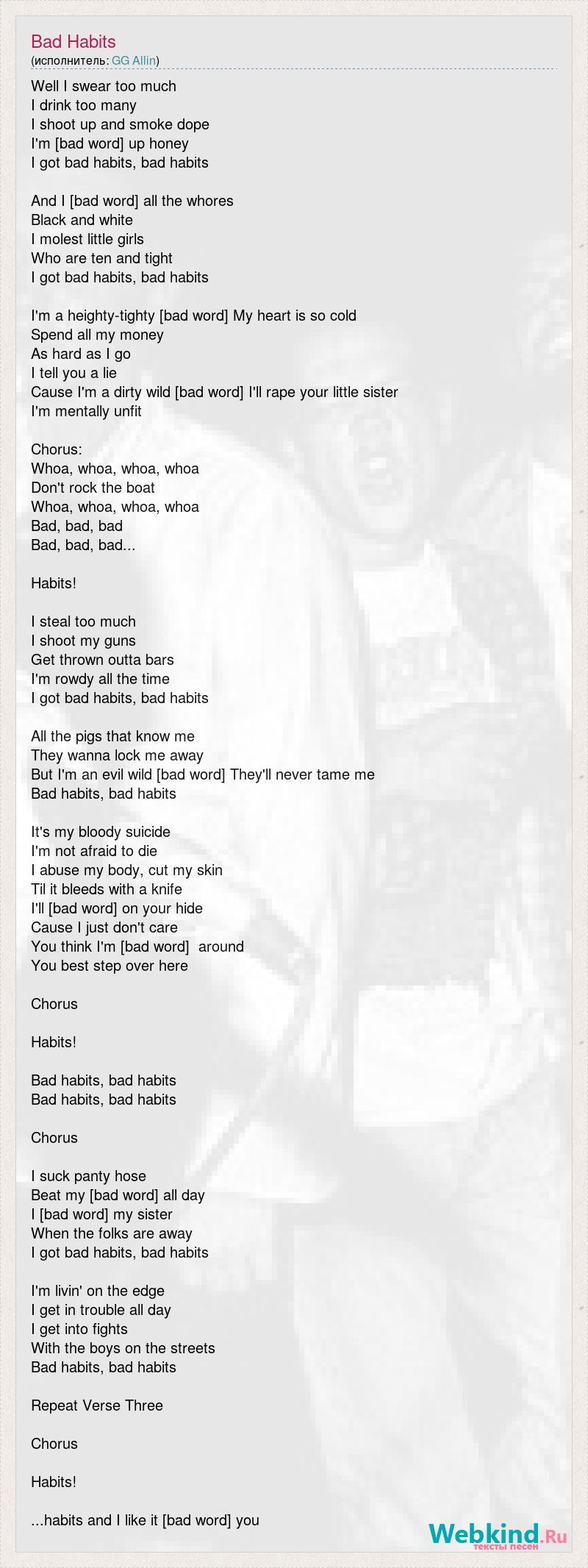 Well I swear too much I drink too many I shoot up and smoke dope I'm [bad word] up honey I got bad habits, bad habits And I [bad word] all the whores Black and white I molest little girls Who are ten and tight I got bad habits, bad habits I'm a heighty-tighty [bad word] My heart is so cold Spend all my money As hard as I go I tell you a lie Cause I'm a dirty wild [bad word] I'll rape your little sister I'm mentally unfit Chorus: Whoa, whoa, whoa, whoa Don't rock the boat Whoa, whoa, whoa, whoa Bad, bad, bad Bad, bad, bad... Habits! I steal too much I shoot my guns Get thrown outta bars I'm rowdy all the time I got bad habits, bad habits All the pigs that know me They wanna lock me away But I'm an evil wild [bad word] They'll never tame me Bad habits, bad habits It's my bloody suicide I'm not afraid to die I abuse my body, cut my skin Til it bleeds with a knife I'll [bad word] on your hide Cause I just don't care You think I'm [bad word] around You best step over here Chorus Habits! Bad habits, bad habits Bad habits, bad habits Chorus I suck panty hose Beat my [bad word] all day I [bad word] my sister When the folks are away I got bad habits, bad habits I'm livin' on the edge I get in trouble all day I get into fights With the boys on the streets Bad habits, bad habits Repeat Verse Three Chorus Habits! ...habits and I like it [bad word] you