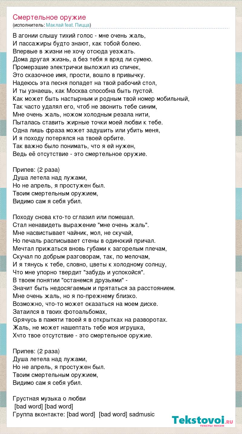 В агонии слышу тихий голос - мне очень жаль, И пассажиры будто знают, как тобой болею. Впервые в жизни не хочу отсюда уезжать. Дома другая жизнь, а без тебя я вряд ли сумею. Промерзшие электрички выложил из спичек, Это сказочное имя, прости, вошло в привычку. Надеюсь эта песня попадет на твой рабочий стол, И ты узнаешь, как Москва способна быть пустой. Как может быть настырным и родным твой номер мобильный, Так часто удалял его, чтоб не звонить тебе синим, Мне очень жаль, ножом холодным резала нити, Пыталась ставить жирные точки моей любви к тебе. Одна лишь фраза может задушить или убить меня, И я походу потерялся на твоей орбите. Так важно было понимать, что я ей нужен, Ведь её отсутствие - это смертельное оружие. Припев: (2 раза) Душа летела над лужами, Но не апрель, я простужен был. Твоим смертельным оружием, Видимо сам я себя убил. Походу снова кто-то сглазил или помешал. Стал ненавидеть выражение "мне очень жаль". Мне насвистывает чайник, мол, не скучай, Но печаль расписывает стены в одинокий причал. Мечтал прижаться вновь губами к загорелым плечам, Скучал по добрым разговорам, так, по мелочам, И я тянусь к тебе, словно, цветы к холодному солнцу, Что мне упорно твердит "забудь и успокойся". В твоем понятии "останемся друзьями" - Значит быть недосягаемым и прятаться за расстоянием. Мне очень жаль, но я по-прежнему близко. Возможно, что-то может оказаться на моем диске. Затаился в твоих фотоальбомах, Gрячусь в памяти твоей я в открытках на разворотах. Жаль, не может нашептать тебе моя игрушка, Xчто твое отсутствие - это смертельное оружие. Припев: (2 раза) Душа летела над лужами, Но не апрель, я простужен был. Твоим смертельным оружием, Видимо сам я себя убил. Грустная музыка о любви [bad word] [bad word] Группа вконтакте: [bad word] [bad word] sadmusic