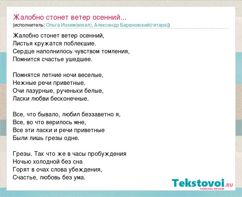 Главная→Исполнители→Ольга Иохим(вокал), Александр Барановский(гитара)→Жалобно стонет ветер осенний...