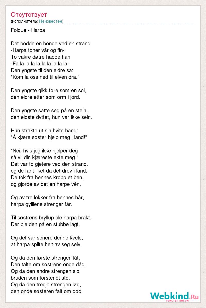 Folque - Harpa Det bodde en bonde ved en strand -Harpa toner vár og fin- To vakre døtre hadde han -Fa la la la la la la la la la- Den yngste til den eldre sa: "Kom la oss ned til elven dra." Den yngste gikk føre som en sol, den eldre etter som orm i jord. Den yngste satte seg på en stein, den eldste dyttet, hun var ikke sein. Hun strakte ut sin hvite hand: "Å kjære søster hjelp meg i land!" "Nei, hvis jeg ikke hjelper deg så vil din kjæreste ekte meg." Det var to gjetere ved den strand, og de fant liket da det drev i land. De tok fra hennes kropp et ben, og gjorde av det en harpe vén. Og av tre lokker fra hennes hår, harpa gylllene strenger får. Til søstrens bryllup ble harpa brakt. Der ble den på en stubbe lagt. Og det var senere denne kveld, at harpa spilte helt av seg selv. Og da den første strengen låt, Den talte om søstrens onde dåd. Og da den andre strengen slo, bruden som forstenet sto. Og da den tredje strengen lød, den onde søsteren falt om død.