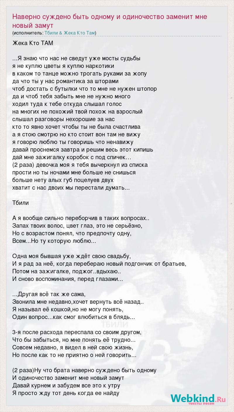 Жека Кто ТАМ ...Я знаю что нас не сведут уже мосты судьбы я не куплю цветы я куплю наркотики в каком то танце можно трогать руками за жопу да что ты у нас романтика за шторами чтоб достать с бутылки что то мне не нужен штопор да и чтоб тебя забыть мне не нужно много ходил туда к тебе откуда слышал голос на многих не похожий твой похож на взрослый слышал разговоры нехорошие за нас кто то явно хочет чтобы ты не была счастлива а я стою смотрю но кто стоит вон там не вижу я говорю люблю ты говоришь что ненавижу давай проснемся завтра и решим весь этот кипишь дай мне зажигалку коробок с под спичек… (2 раза) девочка моя я тебя вычеркнул из списка прости но ты ночами мне больше не снишься больше нету алых губ поцелуев двух хватит с нас двоих мы перестали думать... Тбили А я вообще сильно переборчив в таких вопросах.. Запах твоих волос, цвет глаз, это не серьёзно, Но с возрастом понял, что предпочту одну, Всем...Но ту которую люблю... Одна моя бывшая уже ждёт свою свадьбу, И я рад за неё, когда перебераю новый подгончик от братьев, Потом на зажигалке, поджог..вдыхаю.. И сново воспоминания, перед глазами... ...Другая всё так же сама, Звонила мне недавно,хочет вернуть всё назад.. Я называл её кошкой,но не могу понять, Один вопрос...как смог влюбиться в блядь... 3-я после расхода переспала со своим другом, Что бы забыться, но мне понять её трудно... Совсем недавно, я видел в ней свою жизнь, Но после как то не приятно о ней говорить... (2 раза)Ну что брата наверно суждено быть одному И одиночество заменит мне новый замут Давай курнем и забудем все это к утру Я просто жду тот день когда ее найду