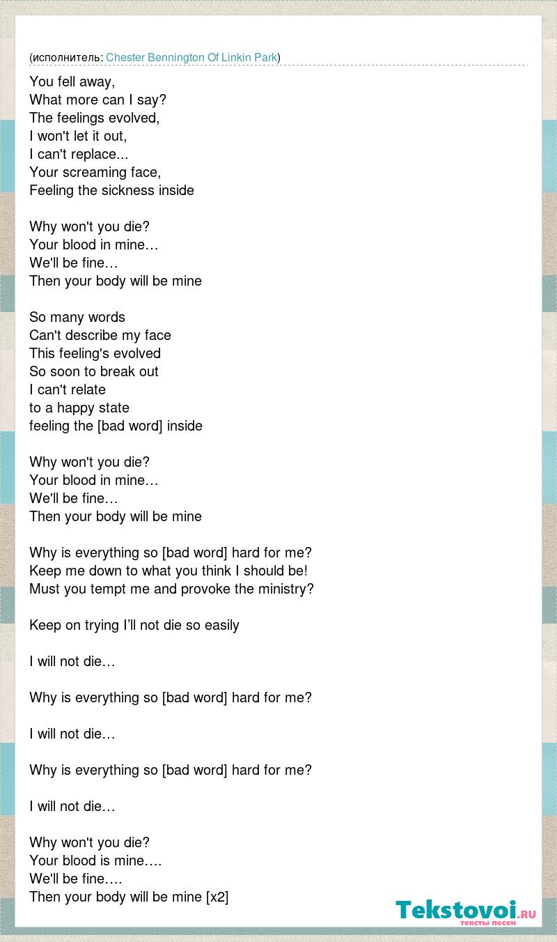 You fell away, What more can I say? The feelings evolved, I won't let it out, I can't replace... Your screaming face, Feeling the sickness inside Why won't you die? Your blood in mine… We'll be fine… Then your body will be mine So many words Can't describe my face This feeling's evolved So soon to break out I can't relate to a happy state feeling the blood run inside Why won't you die? Your blood in mine… We'll be fine… Then your body will be mine Why is everything so [bad word] hard for me? Keep me down to what you think I should be! Must you tempt me and provoke the ministry? Keep on trying I’ll not die so easily I will not die… Why is everything so [bad word] hard for me? I will not die… Why is everything so [bad word] hard for me? I will not die… Why won't you die? Your blood is mine…. We'll be fine…. Then your body will be mine [x2]