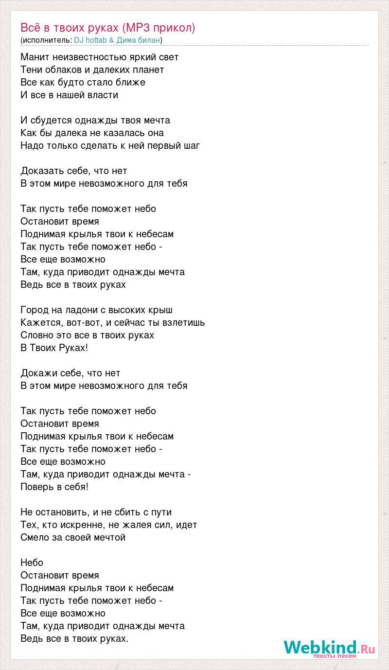 Манит неизвестностью яркий свет Тени облаков и далеких планет Все как будто стало ближе И все в нашей власти И сбудется однажды твоя мечта Как бы далека не казалась она Надо только сделать к ней первый шаг Доказать себе, что нет В этом мире невозможного для тебя Так пусть тебе поможет небо Остановит время Поднимая крылья твои к небесам Так пусть тебе поможет небо - Все еще возможно Там, куда приводит однажды мечта Ведь все в твоих руках Город на ладони с высоких крыш Кажется, вот-вот, и сейчас ты взлетишь Словно это все в твоих руках В Твоих Руках! Докажи себе, что нет В этом мире невозможного для тебя Так пусть тебе поможет небо Остановит время Поднимая крылья твои к небесам Так пусть тебе поможет небо - Все еще возможно Там, куда приводит однажды мечта - Поверь в себя! Не остановить, и не сбить с пути Тех, кто искренне, не жалея сил, идет Смело за своей мечтой Небо Остановит время Поднимая крылья твои к небесам Так пусть тебе поможет небо - Все еще возможно Там, куда приводит однажды мечта Ведь все в твоих руках.