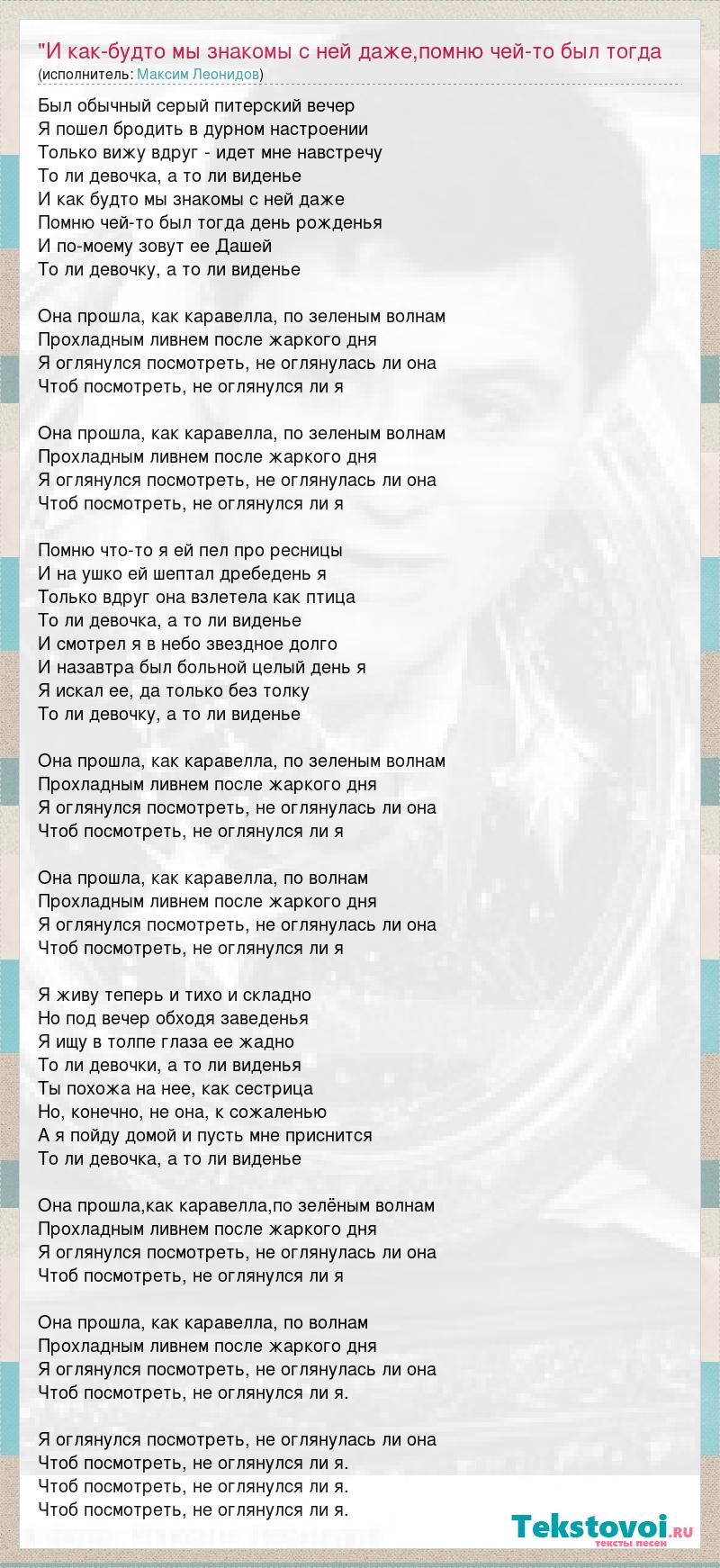 Был обычный серый питерский вечер Я пошел бродить в дурном настроении Только вижу вдруг - идет мне навстречу То ли девочка, а то ли виденье И как будто мы знакомы с ней даже Помню чей-то был тогда день рожденья И по-моему зовут ее Дашей То ли девочку, а то ли виденье Она прошла, как каравелла, по зеленым волнам Прохладным ливнем после жаркого дня Я оглянулся посмотреть, не оглянулась ли она Чтоб посмотреть, не оглянулся ли я Она прошла, как каравелла, по зеленым волнам Прохладным ливнем после жаркого дня Я оглянулся посмотреть, не оглянулась ли она Чтоб посмотреть, не оглянулся ли я Помню что-то я ей пел про ресницы И на ушко ей шептал дребедень я Только вдруг она взлетела как птица То ли девочка, а то ли виденье И смотрел я в небо звездное долго И назавтра был больной целый день я Я искал ее, да только без толку То ли девочку, а то ли виденье Она прошла, как каравелла, по зеленым волнам Прохладным ливнем после жаркого дня Я оглянулся посмотреть, не оглянулась ли она Чтоб посмотреть, не оглянулся ли я Она прошла, как каравелла, по волнам Прохладным ливнем после жаркого дня Я оглянулся посмотреть, не оглянулась ли она Чтоб посмотреть, не оглянулся ли я Я живу теперь и тихо и складно Но под вечер обходя заведенья Я ищу в толпе глаза ее жадно То ли девочки, а то ли виденья Ты похожа на нее, как сестрица Но, конечно, не она, к сожаленью А я пойду домой и пусть мне приснится То ли девочка, а то ли виденье Она прошла,как каравелла,по зелёным волнам Прохладным ливнем после жаркого дня Я оглянулся посмотреть, не оглянулась ли она Чтоб посмотреть, не оглянулся ли я Она прошла, как каравелла, по волнам Прохладным ливнем после жаркого дня Я оглянулся посмотреть, не оглянулась ли она Чтоб посмотреть, не оглянулся ли я. Я оглянулся посмотреть, не оглянулась ли она Чтоб посмотреть, не оглянулся ли я. Чтоб посмотреть, не оглянулся ли я. Чтоб посмотреть, не оглянулся ли я.