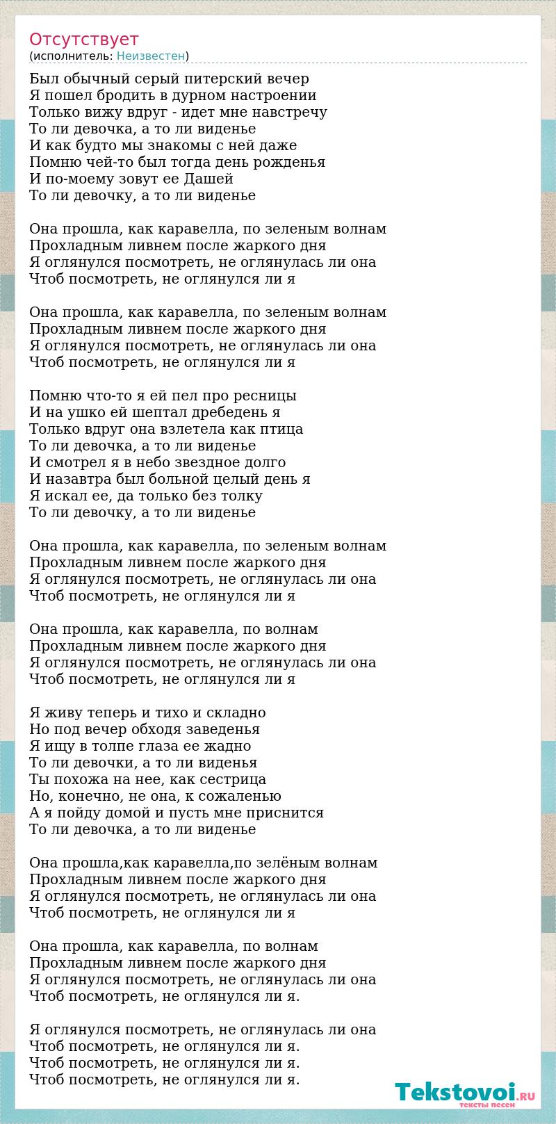 Был обычный серый питерский вечер Я пошел бродить в дурном настроении Только вижу вдруг - идет мне навстречу То ли девочка, а то ли виденье И как будто мы знакомы с ней даже Помню чей-то был тогда день рожденья И по-моему зовут ее Дашей То ли девочку, а то ли виденье Она прошла, как каравелла, по зеленым волнам Прохладным ливнем после жаркого дня Я оглянулся посмотреть, не оглянулась ли она Чтоб посмотреть, не оглянулся ли я Она прошла, как каравелла, по зеленым волнам Прохладным ливнем после жаркого дня Я оглянулся посмотреть, не оглянулась ли она Чтоб посмотреть, не оглянулся ли я Помню что-то я ей пел про ресницы И на ушко ей шептал дребедень я Только вдруг она взлетела как птица То ли девочка, а то ли виденье И смотрел я в небо звездное долго И назавтра был больной целый день я Я искал ее, да только без толку То ли девочку, а то ли виденье Она прошла, как каравелла, по зеленым волнам Прохладным ливнем после жаркого дня Я оглянулся посмотреть, не оглянулась ли она Чтоб посмотреть, не оглянулся ли я Она прошла, как каравелла, по волнам Прохладным ливнем после жаркого дня Я оглянулся посмотреть, не оглянулась ли она Чтоб посмотреть, не оглянулся ли я Я живу теперь и тихо и складно Но под вечер обходя заведенья Я ищу в толпе глаза ее жадно То ли девочки, а то ли виденья Ты похожа на нее, как сестрица Но, конечно, не она, к сожаленью А я пойду домой и пусть мне приснится То ли девочка, а то ли виденье Она прошла,как каравелла,по зелёным волнам Прохладным ливнем после жаркого дня Я оглянулся посмотреть, не оглянулась ли она Чтоб посмотреть, не оглянулся ли я Она прошла, как каравелла, по волнам Прохладным ливнем после жаркого дня Я оглянулся посмотреть, не оглянулась ли она Чтоб посмотреть, не оглянулся ли я. Я оглянулся посмотреть, не оглянулась ли она Чтоб посмотреть, не оглянулся ли я. Чтоб посмотреть, не оглянулся ли я. Чтоб посмотреть, не оглянулся ли я.