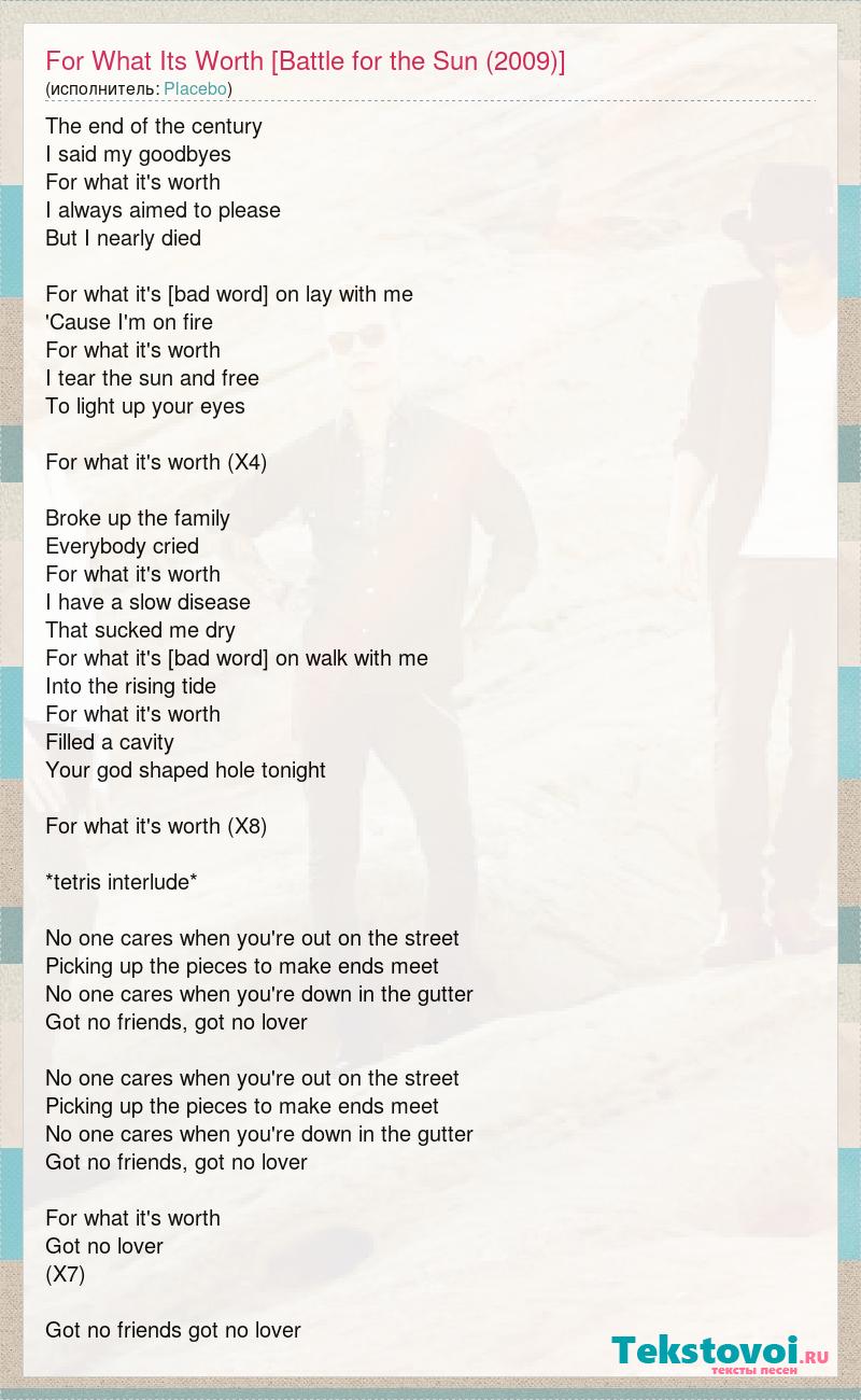 The end of the century I said my goodbyes For what it's worth I always aimed to please But I nearly died For what it's worth Come on lay with me 'Cause I'm on fire For what it's worth I tear the sun and free To light up your eyes For what it's worth (X4) Broke up the family Everybody cried For what it's worth I have a slow disease That sucked me dry For what it's worth Come on walk with me Into the rising tide For what it's worth Filled a cavity Your god shaped hole tonight For what it's worth (X8) *tetris interlude* No one cares when you're out on the street Picking up the pieces to make ends meet No one cares when you're down in the gutter Got no friends, got no lover No one cares when you're out on the street Picking up the pieces to make ends meet No one cares when you're down in the gutter Got no friends, got no lover For what it's worth Got no lover (X7) Got no friends got no lover