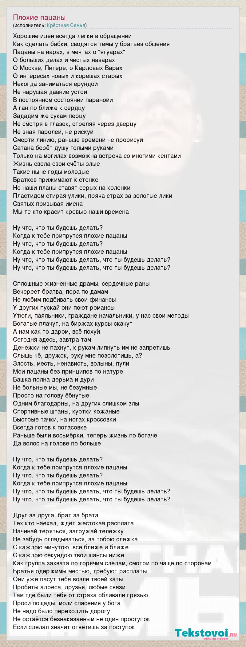 Хорошие идеи всегда легки в обращении Как сделать бабки, сводятся темы у братьев общения Пацаны на нарах, в мечтах о "ягуарах" О больших делах и чистых наварах О Москве, Питере, о Карловых Варах О интересах новых и корешах старых Некогда заниматься ерундой Не нарушая давние устои В постоянном состоянии паранойи А ган по ближе к сердцу Зададим же сукам перцу Не смотря в глазок, стреляя через дверцу Не зная паролей, не рискуй Смерти линию, раньше времени не прорисуй Сатана берёт душу голыми руками Только на могилах возможна встреча со многими кентами Жизнь свела свои счёты злые Такие ныне годы молодые Братков прижимают к стенке Но наши планы ставят серых на коленки Пластидом стирая улики, пряча страх за золотые лики Святых призывая имена Мы те кто красит кровью наши времена Ну что, что ты будешь делать? Когда к тебе припрутся плохие пацаны Ну что, что ты будешь делать? Когда к тебе припрутся плохие пацаны Ну что, что ты будешь делать, что ты будешь делать? Ну что, что ты будешь делать, что ты будешь делать? Сплошные жизненные драмы, сердечные раны Вечереет братва, пора по дамам Не любим подбивать свои финансы У других пускай они поют романсы Утюги, паяльники, граждане начальники, у нас свои методы Богатые плачут, на биржах курсы скачут А нам как то даром, всё похуй Сегодня здесь, завтра там Денежки не пахнут, к рукам липнуть им не запретишь Слышь чё, дружок, руку мне позолотишь, а? Злость, месть, ненависть, волыны, пули Мои пацаны без принципов по натуре Башка полна дерьма и дури Не больные мы, не безумные Просто на голову ёбнутые Одним благодарны, на других слишком злы Спортивные штаны, куртки кожаные Быстрые тачки, на ногах кроссовки Всегда готов к потасовке Раньше были восьмёрки, теперь жизнь по богаче Да волос на голове по больше Ну что, что ты будешь делать? Когда к тебе припрутся плохие пацаны Ну что, что ты будешь делать? Когда к тебе припрутся плохие пацаны Ну что, что ты будешь делать, что ты будешь делать? Ну что, что ты будешь делать, что ты будешь делать? Друг за друга, брат за брата Тех кто наехал, ждёт жестокая расплата Начинай теряться, загружай тележку Не забудь оглядываться, за тобою слежка С каждою минутою, всё ближе и ближе С каждою секундою твои шансы ниже Как группа захвата по горячим следам, смотри по чаще по сторонам Братья одержимы местью, требуют расплаты Они уже пасут тебя возле твоей хаты Пробиты адреса, друзья, любые связи Там где были тебя от страха обливали грязью Проси пощады, моли спасения у бога Не надо было переходить дорогу Не остаётся безнаказанным не один проступок Если сделал значит ответишь за поступок