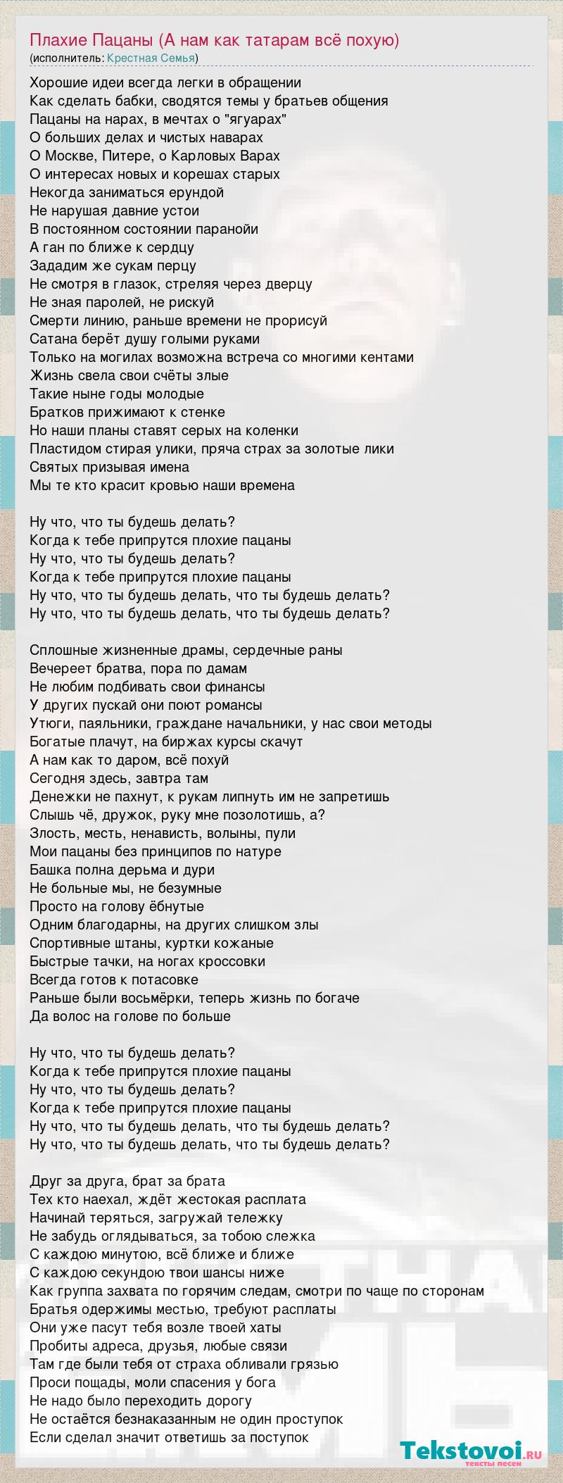 А как ты думаешь, о чем песня "Плахие Пацаны (А нам как татарам всё похую)" ?
