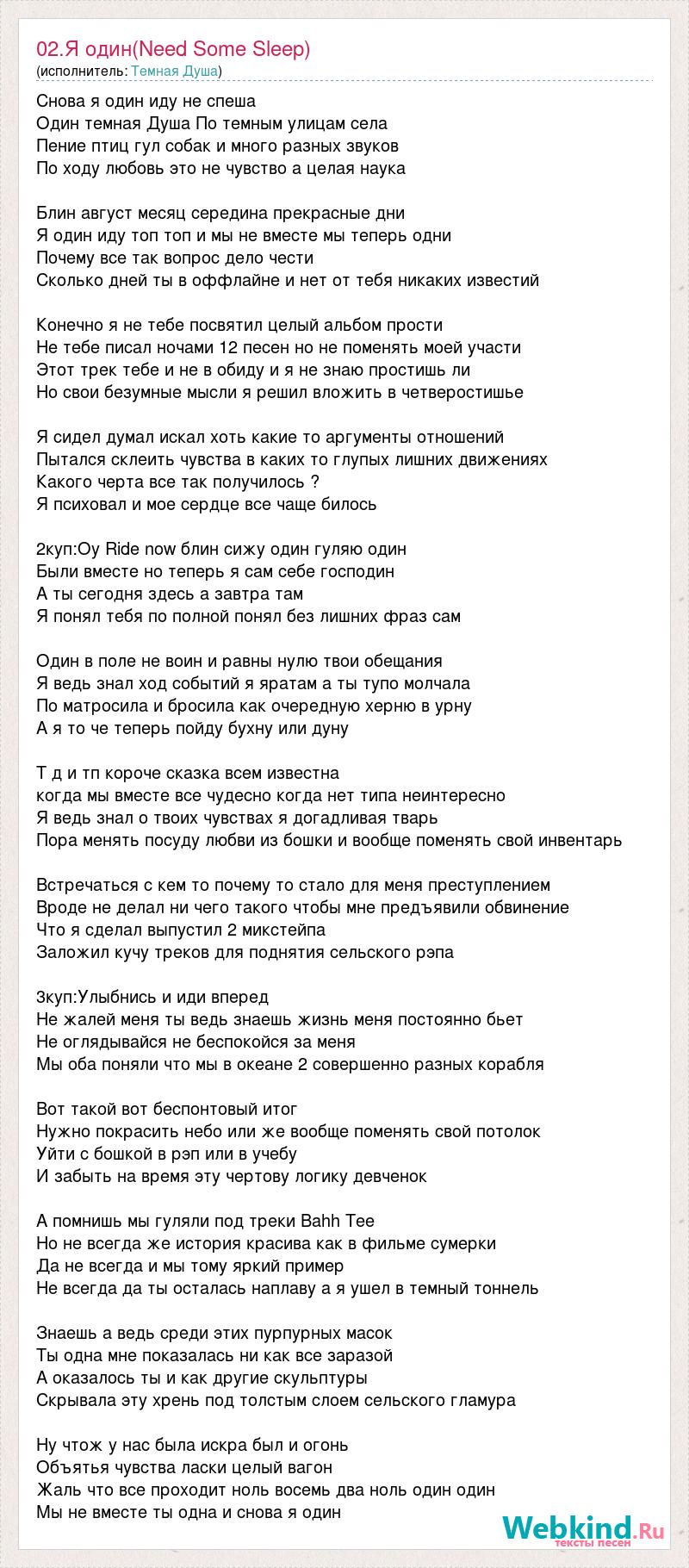 Снова я один иду не спеша Один темная Душа По темным улицам села Пение птиц гул собак и много разных звуков По ходу любовь это не чувство а целая наука Блин август месяц середина прекрасные дни Я один иду топ топ и мы не вместе мы теперь одни Почему все так вопрос дело чести Сколько дней ты в оффлайне и нет от тебя никаких известий Конечно я не тебе посвятил целый альбом прости Не тебе писал ночами 12 песен но не поменять моей участи Этот трек тебе и не в обиду и я не знаю простишь ли Но свои безумные мысли я решил вложить в четверостишье Я сидел думал искал хоть какие то аргументы отношений Пытался склеить чувства в каких то глупых лишних движениях Какого черта все так получилось ? Я психовал и мое сердце все чаще билось 2куп:Оу Ride now блин сижу один гуляю один Были вместе но теперь я сам себе господин А ты сегодня здесь а завтра там Я понял тебя по полной понял без лишних фраз сам Один в поле не воин и равны нулю твои обещания Я ведь знал ход событий я яратам а ты тупо молчала По матросила и бросила как очередную херню в урну А я то че теперь пойду бухну или дуну Т д и тп короче сказка всем известна когда мы вместе все чудесно когда нет типа неинтересно Я ведь знал о твоих чувствах я догадливая тварь Пора менять посуду любви из бошки и вообще поменять свой инвентарь Встречаться с кем то почему то стало для меня преступлением Вроде не делал ни чего такого чтобы мне предъявили обвинение Что я сделал выпустил 2 микстейпа Заложил кучу треков для поднятия сельского рэпа 3куп:Улыбнись и иди вперед Не жалей меня ты ведь знаешь жизнь меня постоянно бьет Не оглядывайся не беспокойся за меня Мы оба поняли что мы в океане 2 совершенно разных корабля Вот такой вот беспонтовый итог Нужно покрасить небо или же вообще поменять свой потолок Уйти с бошкой в рэп или в учебу И забыть на время эту чертову логику девченок А помнишь мы гуляли под треки Bahh Tee Но не всегда же история красива как в фильме сумерки Да не всегда и мы тому яркий пример Не всегда да ты осталась наплаву а я ушел в темный тоннель Знаешь а ведь среди этих пурпурных масок Ты одна мне показалась ни как все заразой А оказалось ты и как другие скульптуры Скрывала эту хрень под толстым слоем сельского гламура Ну чтож у нас была искра был и огонь Объятья чувства ласки целый вагон Жаль что все проходит ноль восемь два ноль один один Мы не вместе ты одна и снова я один