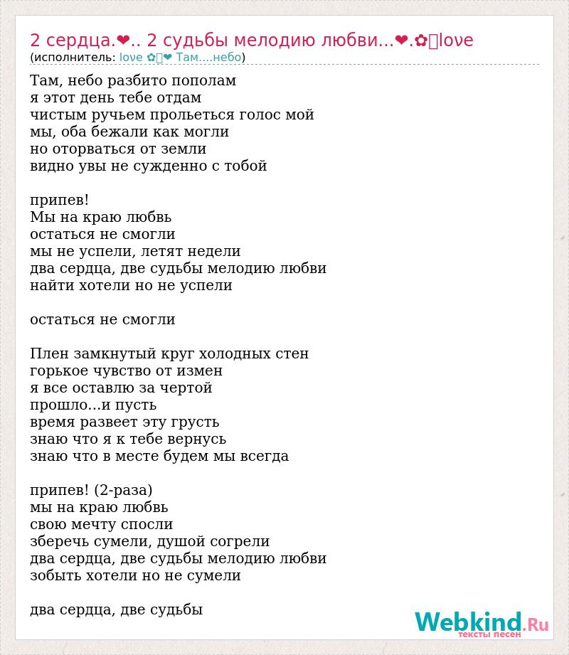 Там, небо разбито пополам я этот день тебе отдам чистым ручьем прольеться голос мой мы, оба бежали как могли но оторваться от земли видно увы не сужденно с тобой припев! Мы на краю любвь остаться не смогли мы не успели, летят недели два сердца, две судьбы мелодию любви найти хотели но не успели остаться не смогли Плен замкнутый круг холодных стен горькое чувство от измен я все оставлю за чертой прошло...и пусть время развеет эту грусть знаю что я к тебе вернусь знаю что в месте будем мы всегда припев! (2-раза) мы на краю любвь свою мечту спосли зберечь сумели, душой согрели два сердца, две судьбы мелодию любви зобыть хотели но не сумели два сердца, две судьбы
