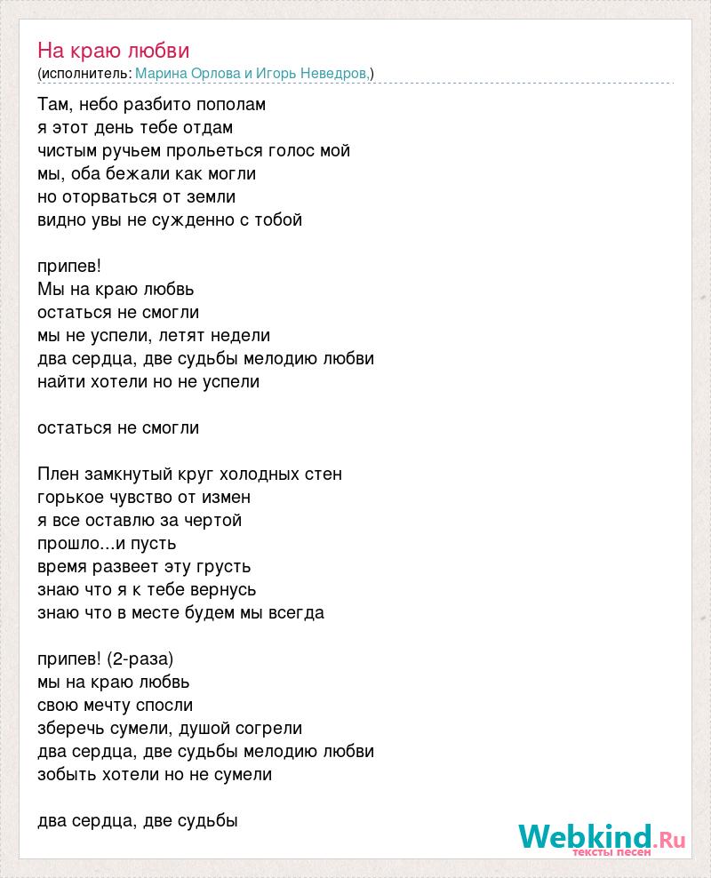 Там, небо разбито пополам я этот день тебе отдам чистым ручьем прольеться голос мой мы, оба бежали как могли но оторваться от земли видно увы не сужденно с тобой припев! Мы на краю любвь остаться не смогли мы не успели, летят недели два сердца, две судьбы мелодию любви найти хотели но не успели остаться не смогли Плен замкнутый круг холодных стен горькое чувство от измен я все оставлю за чертой прошло...и пусть время развеет эту грусть знаю что я к тебе вернусь знаю что в месте будем мы всегда припев! (2-раза) мы на краю любвь свою мечту спосли зберечь сумели, душой согрели два сердца, две судьбы мелодию любви зобыть хотели но не сумели два сердца, две судьбы