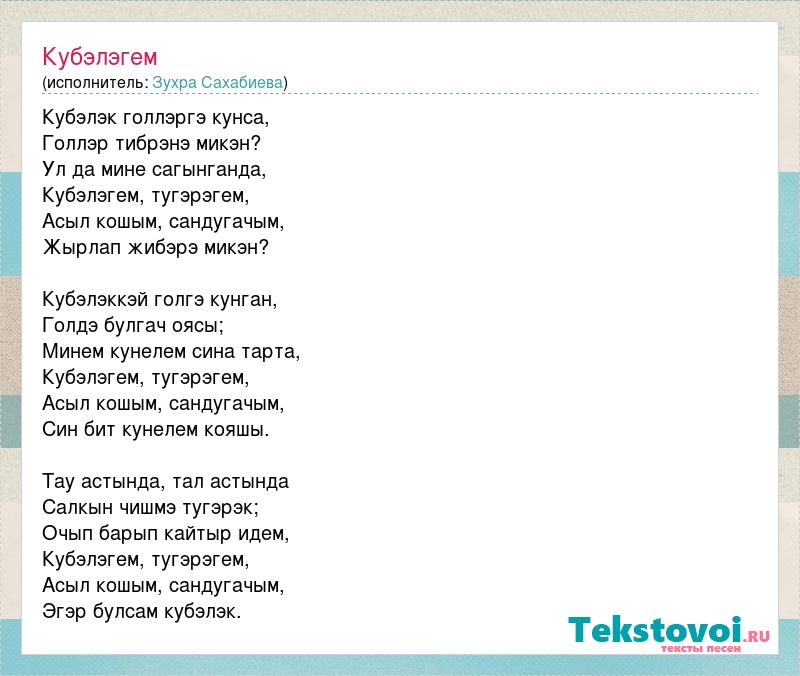 Кубэлэк голлэргэ кунса, Голлэр тибрэнэ микэн? Ул да мине сагынганда, Кубэлэгем, тугэрэгем, Асыл кошым, сандугачым, Жырлап жибэрэ микэн? Кубэлэккэй голгэ кунган, Голдэ булгач оясы; Минем кунелем сина тарта, Кубэлэгем, тугэрэгем, Асыл кошым, сандугачым, Син бит кунелем кояшы. Тау астында, тал астында Салкын чишмэ тугэрэк; Очып барып кайтыр идем, Кубэлэгем, тугэрэгем, Асыл кошым, сандугачым, Эгэр булсам кубэлэк.