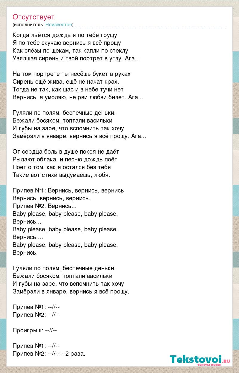 Когда льётся дождь я по тебе грущу Я по тебе скучаю вернись я всё прощу Как слёзы по щекам, так капли по стеклу Увядшая сирень и твой портрет в углу. Ага... На том портрете ты несёшь букет в руках Сирень ещё жива, ещё не начат крах. Тогда не так, как щас и в небе тучи нет Вернись, я умоляю, не рви любви билет. Ага... Гуляли по полям, беспечные деньки. Бежали босяком, топтали васильки И губы на заре, что вспомнить так хочу Замёрзли в январе, вернись я всё прощу. Ага... От сердца боль в душе покоя не даёт Рыдают облака, и песню дождь поёт Поёт о том, как я остался без тебя Такие вот стихи выдумаешь, любя. Припев №1: Вернись, вернись, вернись Вернись, вернись, вернись. Припев №2: Вернись... Baby please, baby please, baby please. Вернись... Baby please, baby please, baby please. Вернись.... Baby please, baby please, baby please. Вернись. Гуляли по полям, беспечные деньки. Бежали босяком, топтали васильки И губы на заре, что вспомнить так хочу Замёрзли в январе, вернись я всё прощу. Припев №1: --//-- Припев №2: --//-- Проигрыш: --//-- Припев №1: --//-- Припев №2: --//-- - 2 раза.