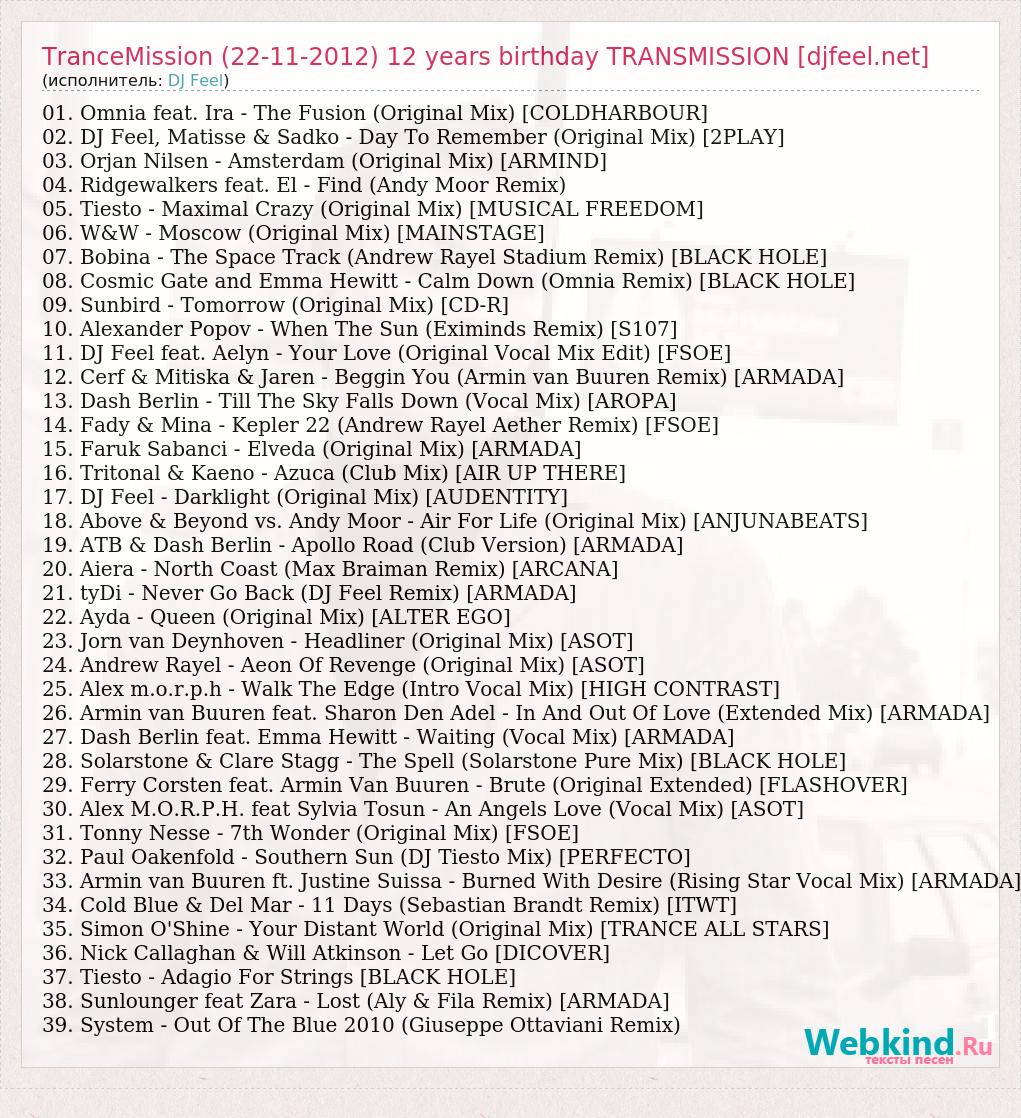 А как ты думаешь, о чем песня "TranceMission (22-11-2012) 12 years birthday TRANSMISSION [djfeel.net]" ?