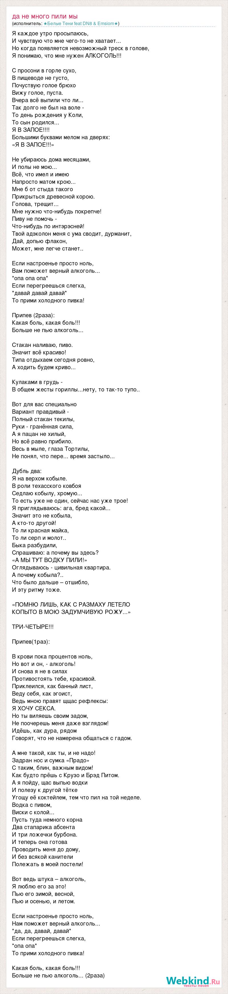 Я каждое утро просыпаюсь, И чувствую что мне чего-то не хватает... Но когда появляется невозможный треск в голове, Я понимаю, что мне нужен АЛКОГОЛЬ!!! С просони в горле сухо, В пищеводе не густо, Почуствую голое брюхо Вижу голое, пуста. Вчера всё выпили что ли... Так долго не был на воле - То день рождения у Коли, То сын родился... Я В ЗАПОЕ!!!! Большими буквами мелом на дверях: «Я В ЗАПОЕ!!!» Не убираюсь дома месяцами, И полы не мою... Всё, что имел и имею Напросто матом крою... Мне б от стыда такого Прикрыться древесной корою. Голова, трещит... Мне нужно что-нибудь покрепче! Пиву не помочь - Что-нибудь по интэрэсней! Твой адэколон меня с ума сводит, дурманит, Дай, допью флакон, Может, мне легче станет.. Если настроенье просто ноль, Вам поможет верный алкоголь... *опа опа опа* Если перегреешься слегка, *давай давай давай* То прими холодного пивка! Припев (2раза): Какая боль, какая боль!!! Больше не пью алкоголь... Стакан наливаю, пиво. Значит всё красиво! Типа отдыхаем сегодня ровно, А ходить будем криво... Кулаками в грудь - В общем жесты гориллы...нету, то так-то тупо.. Вот для вас специально Вариант правдивый - Полный стакан текилы, Руки - гранённая сила, А я пацан не хилый, Но всё равно прибило. Весь в мыле, глаза Тортилы, Не понял, что пере... время застыло... Дубль два: Я на верхом кобыле. В роли техасского ковбоя Седлаю кобылу, хромую... То есть уже не один, сейчас нас уже трое! Я приглядываюсь: ага, бред какой... Значит это не кобыла, А кто-то другой! То ли красная майка, То ли серп и молот.. Быка разбудили, Спрашиваю: а почему вы здесь? «А МЫ ТУТ ВОДКУ ПИЛИ!» Оглядываюсь - цивильная квартира. А почему кобыла?.. Что было дальше – отшибло, И эту ритму тоже. «ПОМНЮ ЛИШЬ, КАК С РАЗМАХУ ЛЕТЕЛО КОПЫТО В МОЮ ЗАДУМЧИВУЮ РОЖУ...» ТРИ-ЧЕТЫРЕ!!! Припев(1раз): В крови пока процентов ноль, Но вот и он, - алкоголь! И снова я не в силах Противостоять тебе, красивой. Приклеился, как банный лист, Веду себя, как эгоист, Ведь мною правят щщас рефлексы: Я ХОЧУ СЕКСА. Но ты виляешь своим задом, Не поочерешь меня даже взглядом! Идёшь, как дура, рядом Говорят, что не намерена общаться с гадом. А мне такой, как ты, и не надо! Задран нос и сумка «Прадо» С таким, блин, важным видом! Как будто прёшь с Крузо и Брэд Питом. А я пойду, щас выпью водки И полезу к другой тётке Угощу её коктейлем, тем что пил на той неделе. Водка с пивом, Виски с колой... Пусть туда немного корна Два стапарика абсента И три ложечки бурбона. И теперь она готова Проводить меня до дому, И без всякой канители Полежать в моей постели! Вот ведь штука – алкоголь, Я люблю его за это! Пью его зимой, весной, Пью и осенью, и летом. Если настроенье просто ноль, Нам поможет верный алкоголь... *да, да, давай, давай* Если перегреешься слегка, *опа опа* То прими холодного пивка! Какая боль, какая боль!!! Больше не пью алкоголь... (2раза)