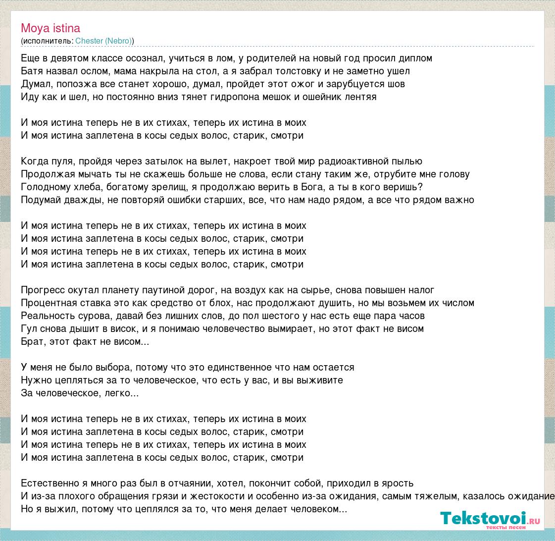 Еще в девятом классе осознал, учиться в лом, у родителей на новый год просил диплом Батя назвал ослом, мама накрыла на стол, а я забрал толстовку и не заметно ушел Думал, попозжа все станет хорошо, думал, пройдет этот ожог и зарубцуется шов Иду как и шел, но постоянно вниз тянет гидропона мешок и ошейник лентяя И моя истина теперь не в их стихах, теперь их истина в моих И моя истина заплетена в косы седых волос, старик, смотри Когда пуля, пройдя через затылок на вылет, накроет твой мир радиоактивной пылью Продолжая мычать ты не скажешь больше не слова, если стану таким же, отрубите мне голову Голодному хлеба, богатому зрелищ, я продолжаю верить в Бога, а ты в кого веришь? Подумай дважды, не повторяй ошибки старших, все, что нам надо рядом, а все что рядом важно И моя истина теперь не в их стихах, теперь их истина в моих И моя истина заплетена в косы седых волос, старик, смотри И моя истина теперь не в их стихах, теперь их истина в моих И моя истина заплетена в косы седых волос, старик, смотри Прогресс окутал планету паутиной дорог, на воздух как на сырье, снова повышен налог Процентная ставка это как средство от блох, нас продолжают душить, но мы возьмем их числом Реальность сурова, давай без лишних слов, до пол шестого у нас есть еще пара часов Гул снова дышит в висок, и я понимаю человечество вымирает, но этот факт не висом Брат, этот факт не висом... У меня не было выбора, потому что это единственное что нам остается Нужно цепляться за то человеческое, что есть у вас, и вы выживите За человеческое, легко... И моя истина теперь не в их стихах, теперь их истина в моих И моя истина заплетена в косы седых волос, старик, смотри И моя истина теперь не в их стихах, теперь их истина в моих И моя истина заплетена в косы седых волос, старик, смотри Естественно я много раз был в отчаянии, хотел, покончит собой, приходил в ярость И из-за плохого обращения грязи и жестокости и особенно из-за ожидания, самым тяжелым, казалось ожидание Но я выжил, потому что цеплялся за то, что меня делает человеком...