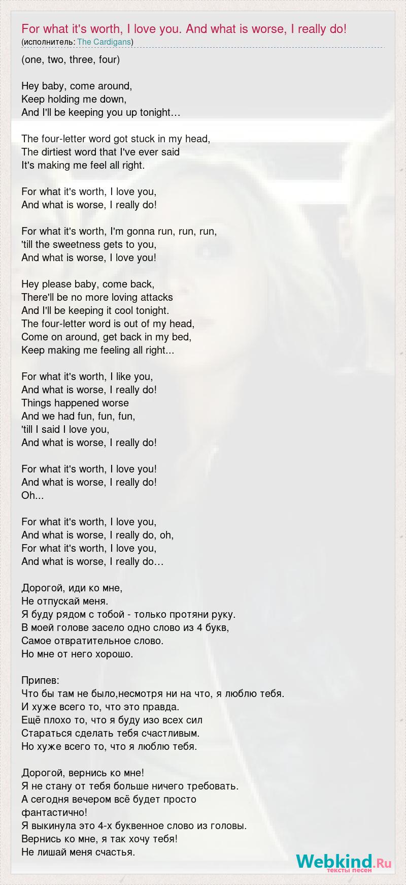 (one, two, three, four) Hey baby, come around, Keep holding me down, And I'll be keeping you up tonight… The four-letter word got stuck in my head, The dirtiest word that I've ever said It's making me feel all right. For what it's worth, I love you, And what is worse, I really do! For what it's worth, I'm gonna run, run, run, 'till the sweetness gets to you, And what is worse, I love you! Hey please baby, come back, There'll be no more loving attacks And I'll be keeping it cool tonight. The four-letter word is out of my head, Come on around, get back in my bed, Keep making me feeling all right... For what it's worth, I like you, And what is worse, I really do! Things happened worse And we had fun, fun, fun, 'till I said I love you, And what is worse, I really do! For what it's worth, I love you! And what is worse, I really do! Oh... For what it's worth, I love you, And what is worse, I really do, oh, For what it's worth, I love you, And what is worse, I really do… Дорогой, иди ко мне, Не отпускай меня. Я буду рядом с тобой - только протяни руку. В моей голове засело одно слово из 4 букв, Самое отвратительное слово. Но мне от него хорошо. Припев: Что бы там не было,несмотря ни на что, я люблю тебя. И хуже всего то, что это правда. Ещё плохо то, что я буду изо всех сил Стараться сделать тебя счастливым. Но хуже всего то, что я люблю тебя. Дорогой, вернись ко мне! Я не стану от тебя больше ничего требовать. А сегодня вечером всё будет просто фантастично! Я выкинула это 4-х буквенное слово из головы. Вернись ко мне, я так хочу тебя! Не лишай меня счастья.