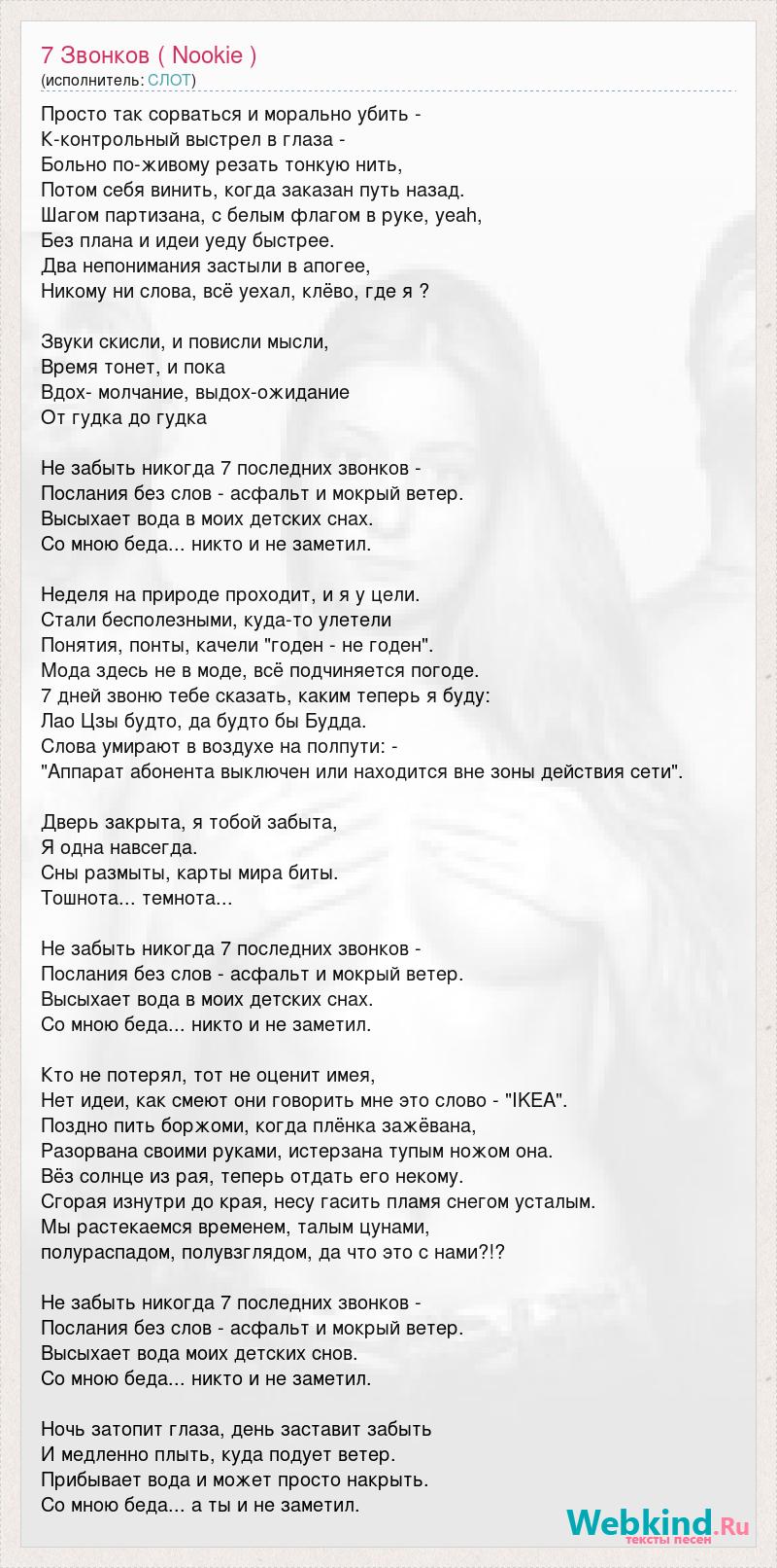 Просто так сорваться и морально убить - К-контрольный выстрел в глаза - Больно по-живому резать тонкую нить, Потом себя винить, когда заказан путь назад. Шагом партизана, с белым флагом в руке, уеаh, Без плана и идеи уеду быстрее. Два непонимания застыли в апогее, Никому ни слова, всё уехал, клёво, где я ? Звуки скисли, и повисли мысли, Время тонет, и пока Вдох- молчание, выдох-ожиданиe От гудка до гудка Не забыть никогда 7 последних звонков - Послания без слов - асфальт и мокрый ветер. Высыхает вода в моих детских снах. Со мною беда... никто и не заметил. Неделя на природе проходит, и я у цели. Стали бесполезными, куда-то улетели Понятия, понты, качели "годен - не годен". Мода здесь не в моде, всё подчиняется погоде. 7 дней звоню тебе сказать, каким теперь я буду: Лао Цзы будто, да будто бы Будда. Cлова умирают в воздухе на полпути: - "Аппарат абонента выключен или находится вне зоны действия сети". Дверь закрыта, я тобой забыта, Я одна навсегда. Сны размыты, карты мира биты. Тошнота... темнота... Не забыть никогда 7 последних звонков - Послания без слов - асфальт и мокрый ветер. Высыхает вода в моих детских снах. Со мною беда... никто и не заметил. Кто не потерял, тот не оценит имея, Нет идеи, как смеют они говорить мне это слово - "IKEA". Поздно пить боржоми, когда плёнка зажёвана, Разорвана своими руками, истерзана тупым ножом она. Вёз солнце из рая, теперь отдать его некому. Сгорая изнутри до края, несу гасить пламя снегом усталым. Mы растекаемся временем, талым цунами, полураспадом, полувзглядом, да что это с нами?!? Не забыть никогда 7 последних звонков - Послания без слов - асфальт и мокрый ветер. Высыхает вода моих детских снов. Со мною беда... никто и не заметил. Ночь затопит глаза, день заставит забыть И медленно плыть, куда подует ветер. Прибывает вода и может просто накрыть. Со мною беда... а ты и не заметил.