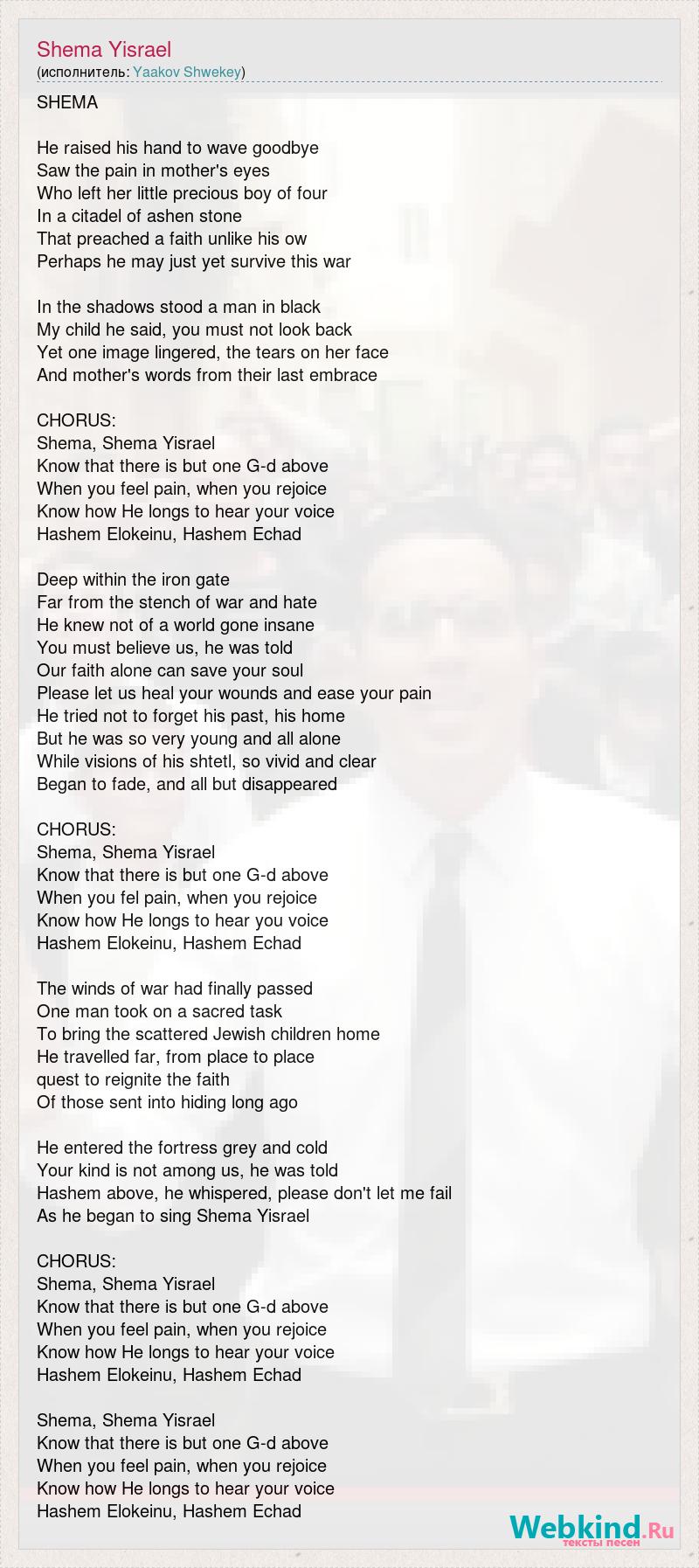SHEMA He raised his hand to wave goodbye Saw the pain in mother's eyes Who left her little precious boy of four In a citadel of ashen stone That preached a faith unlike his ow Perhaps he may just yet survive this war In the shadows stood a man in black My child he said, you must not look back Yet one image lingered, the tears on her face And mother's words from their last embrace CHORUS: Shema, Shema Yisrael Know that there is but one G-d above When you feel pain, when you rejoice Know how He longs to hear your voice Hashem Elokeinu, Hashem Echad Deep within the iron gate Far from the stench of war and hate He knew not of a world gone insane You must believe us, he was told Our faith alone can save your soul Please let us heal your wounds and ease your pain He tried not to forget his past, his home But he was so very young and all alone While visions of his shtetl, so vivid and clear Began to fade, and all but disappeared CHORUS: Shema, Shema Yisrael Know that there is but one G-d above When you fel pain, when you rejoice Know how He longs to hear you voice Hashem Elokeinu, Hashem Echad The winds of war had finally passed One man took on a sacred task To bring the scattered Jewish children home He travelled far, from place to place quest to reignite the faith Of those sent into hiding long ago He entered the fortress grey and cold Your kind is not among us, he was told Hashem above, he whispered, please don't let me fail As he began to sing Shema Yisrael CHORUS: Shema, Shema Yisrael Know that there is but one G-d above When you feel pain, when you rejoice Know how He longs to hear your voice Hashem Elokeinu, Hashem Echad Shema, Shema Yisrael Know that there is but one G-d above When you feel pain, when you rejoice Know how He longs to hear your voice Hashem Elokeinu, Hashem Echad