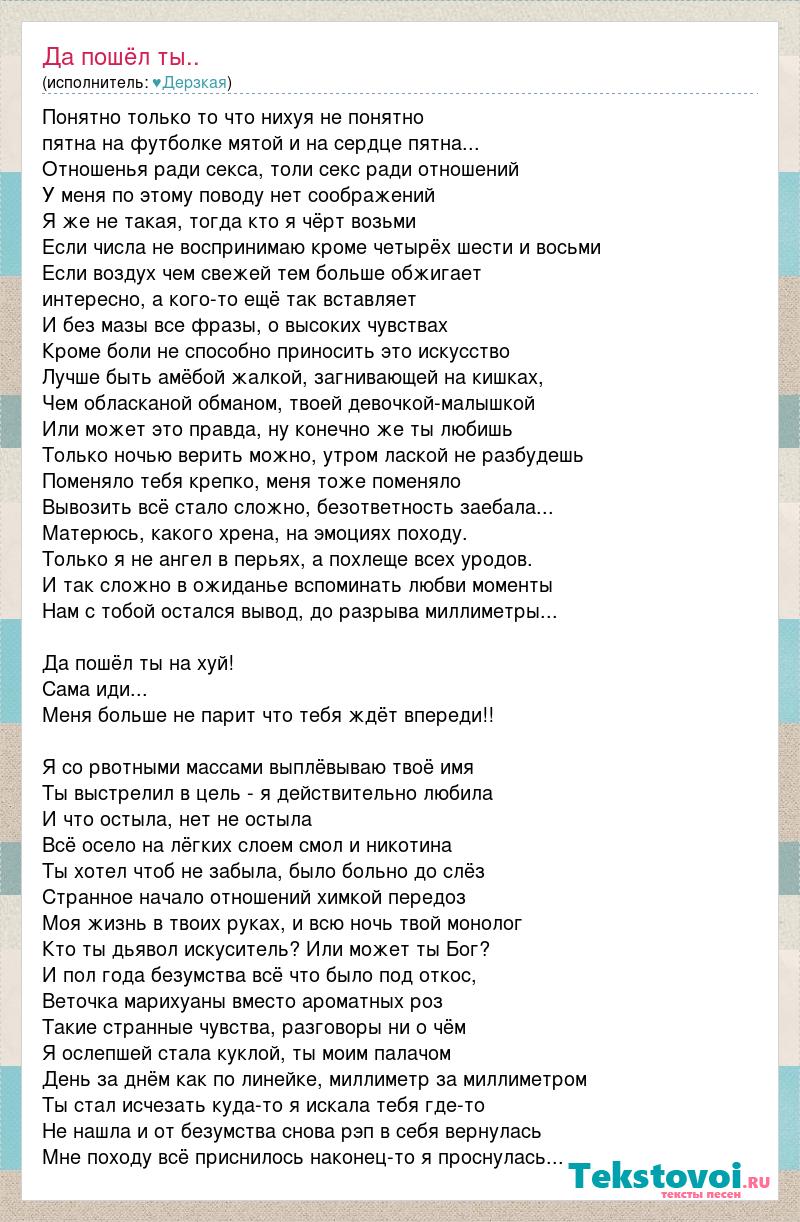 Понятно только то что нихуя не понятно пятна на футболке мятой и на сердце пятна... Отношенья ради секса, толи секс ради отношений У меня по этому поводу нет соображений Я же не такая, тогда кто я чёрт возьми Если числа не воспринимаю кроме четырёх шести и восьми Если воздух чем свежей тем больше обжигает интересно, а кого-то ещё так вставляет И без мазы все фразы, о высоких чувствах Кроме боли не способно приносить это искусство Лучше быть амёбой жалкой, загнивающей на кишках, Чем обласканой обманом, твоей девочкой-малышкой Или может это правда, ну конечно же ты любишь Только ночью верить можно, утром лаской не разбудешь Поменяло тебя крепко, меня тоже поменяло Вывозить всё стало сложно, безответность заебала... Матерюсь, какого хрена, на эмоциях походу. Только я не ангел в перьях, а похлеще всех уродов. И так сложно в ожиданье вспоминать любви моменты Нам с тобой остался вывод, до разрыва миллиметры... Да пошёл ты на хуй! Сама иди... Меня больше не парит что тебя ждёт впереди!! Я со рвотными массами выплёвываю твоё имя Ты выстрелил в цель - я действительно любила И что остыла, нет не остыла Всё осело на лёгких слоем смол и никотина Ты хотел чтоб не забыла, было больно до слёз Странное начало отношений химкой передоз Моя жизнь в твоих руках, и всю ночь твой монолог Кто ты дьявол искуситель? Или может ты Бог? И пол года безумства всё что было под откос, Веточка марихуаны вместо ароматных роз Такие странные чувства, разговоры ни о чём Я ослепшей стала куклой, ты моим палачом День за днём как по линейке, миллиметр за миллиметром Ты стал исчезать куда-то я искала тебя где-то Не нашла и от безумства снова рэп в себя вернулась Мне походу всё приснилось наконец-то я проснулась...