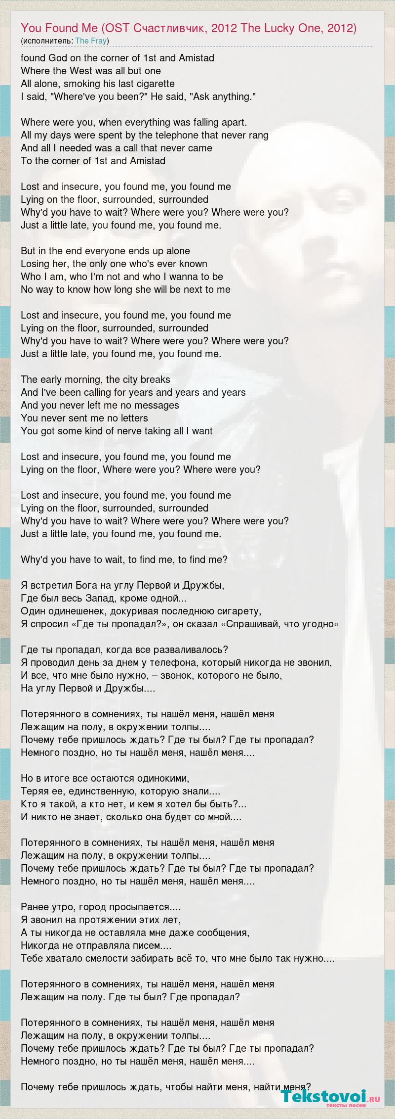 found God on the corner of 1st and Amistad Where the West was all but one All alone, smoking his last cigarette I said, "Where've you been?" He said, "Ask anything." Where were you, when everything was falling apart. All my days were spent by the telephone that never rang And all I needed was a call that never came To the corner of 1st and Amistad Lost and insecure, you found me, you found me Lying on the floor, surrounded, surrounded Why'd you have to wait? Where were you? Where were you? Just a little late, you found me, you found me. But in the end everyone ends up alone Losing her, the only one who's ever known Who I am, who I'm not and who I wanna to be No way to know how long she will be next to me Lost and insecure, you found me, you found me Lying on the floor, surrounded, surrounded Why'd you have to wait? Where were you? Where were you? Just a little late, you found me, you found me. The early morning, the city breaks And I've been calling for years and years and years And you never left me no messages You never sent me no letters You got some kind of nerve taking all I want Lost and insecure, you found me, you found me Lying on the floor, Where were you? Where were you? Lost and insecure, you found me, you found me Lying on the floor, surrounded, surrounded Why'd you have to wait? Where were you? Where were you? Just a little late, you found me, you found me. Why'd you have to wait, to find me, to find me? Я встретил Бога на углу Первой и Дружбы, Где был весь Запад, кроме одной... Один одинешенек, докуривая последнюю сигарету, Я спросил «Где ты пропадал?», он сказал «Спрашивай, что угодно» Где ты пропадал, когда все разваливалось? Я проводил день за днем у телефона, который никогда не звонил, И все, что мне было нужно, – звонок, которого не было, На углу Первой и Дружбы.... Потерянного в сомнениях, ты нашёл меня, нашёл меня Лежащим на полу, в окружении толпы.... Почему тебе пришлось ждать? Где ты был? Где ты пропадал? Немного поздно, но ты нашёл меня, нашёл меня.... Но в итоге все остаются одинокими, Теряя ее, единственную, которую знали.... Кто я такой, а кто нет, и кем я хотел бы быть?... И никто не знает, сколько она будет со мной.... Потерянного в сомнениях, ты нашёл меня, нашёл меня Лежащим на полу, в окружении толпы.... Почему тебе пришлось ждать? Где ты был? Где ты пропадал? Немного поздно, но ты нашёл меня, нашёл меня.... Ранее утро, город просыпается.... Я звонил на протяжении этих лет, А ты никогда не оставляла мне даже сообщения, Никогда не отправляла писем.... Тебе хватало смелости забирать всё то, что мне было так нужно.... Потерянного в сомнениях, ты нашёл меня, нашёл меня Лежащим на полу. Где ты был? Где пропадал? Потерянного в сомнениях, ты нашёл меня, нашёл меня Лежащим на полу, в окружении толпы.... Почему тебе пришлось ждать? Где ты был? Где ты пропадал? Немного поздно, но ты нашёл меня, нашёл меня.... Почему тебе пришлось ждать, чтобы найти меня, найти меня?