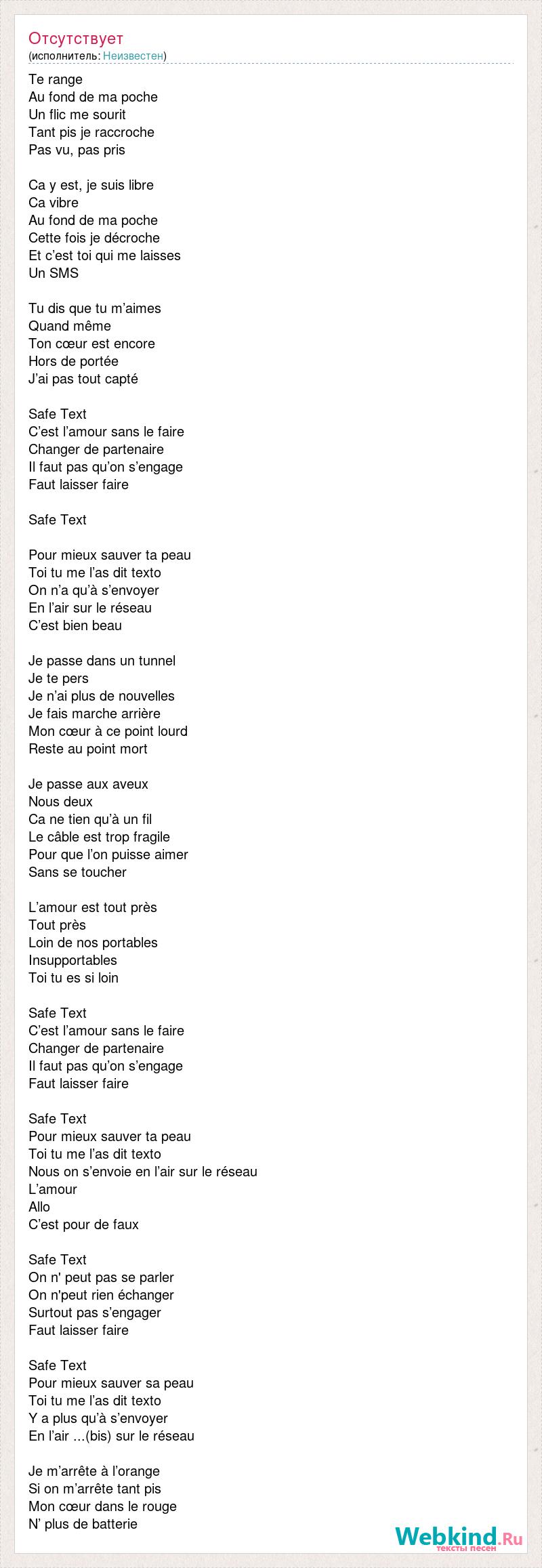 Te range Au fond de ma poche Un flic me sourit Tant pis je raccroche Pas vu, pas pris Ca y est, je suis libre Ca vibre Au fond de ma poche Cette fois je décroche Et c’est toi qui me laisses Un SMS Tu dis que tu m’aimes Quand même Ton cœur est encore Hors de portée J’ai pas tout capté Safe Text C’est l’amour sans le faire Changer de partenaire Il faut pas qu’on s’engage Faut laisser faire Safe Text Pour mieux sauver ta peau Toi tu me l’as dit texto On n’a qu’à s’envoyer En l’air sur le réseau C’est bien beau Je passe dans un tunnel Je te pers Je n’ai plus de nouvelles Je fais marche arrière Mon cœur à ce point lourd Reste au point mort Je passe aux aveux Nous deux Ca ne tien qu’à un fil Le câble est trop fragile Pour que l’on puisse aimer Sans se toucher L’amour est tout près Tout près Loin de nos portables Insupportables Toi tu es si loin Safe Text C’est l’amour sans le faire Changer de partenaire Il faut pas qu’on s’engage Faut laisser faire Safe Text Pour mieux sauver ta peau Toi tu me l’as dit texto Nous on s’envoie en l’air sur le réseau L’amour Allo C’est pour de faux Safe Text On n' peut pas se parler On n'peut rien échanger Surtout pas s’engager Faut laisser faire Safe Text Pour mieux sauver sa peau Toi tu me l’as dit texto Y a plus qu’à s’envoyer En l’air ...(bis) sur le réseau Je m’arrête à l’orange Si on m’arrête tant pis Mon cœur dans le rouge N’ plus de batterie