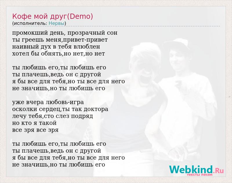 промокший день, прозрачный сон ты греешь меня,привет-привет наивный дух в тебя влюблен хотел бы обнять,но нет,но нет ты любишь его,ты любишь его ты плачешь,ведь он с другой я бы все для тебя,но ты все для него не значишь,но ты любишь его уже вчера любовь-игра осколки сердец,ты так доктора лечу тебя,сто слез подряд но кто я такой все зря все зря ты любишь его,ты любишь его ты плачешь,ведь он с другой я бы все для тебя,но ты все для него не значишь,но ты любишь его