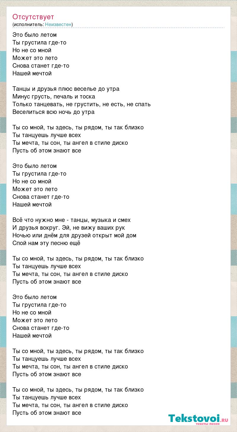Это было летом Ты грустила где-то Но не со мной Может это лето Снова станет где-то Нашей мечтой Танцы и друзья плюс веселье до утра Минус грусть, печаль и тоска Только танцевать, не грустить, не есть, не спать Веселиться всю ночь до утра Ты со мной, ты здесь, ты рядом, ты так близко Ты танцуешь лучше всех Ты мечта, ты сон, ты ангел в стиле диско Пусть об этом знают все Это было летом Ты грустила где-то Но не со мной Может это лето Снова станет где-то Нашей мечтой Всё что нужно мне - танцы, музыка и смех И друзья вокруг. Эй, не вижу ваших рук Ночью или днём для друзей открыт мой дом Спой нам эту песню ещё Ты со мной, ты здесь, ты рядом, ты так близко Ты танцуешь лучше всех Ты мечта, ты сон, ты ангел в стиле диско Пусть об этом знают все Это было летом Ты грустила где-то Но не со мной Может это лето Снова станет где-то Нашей мечтой Ты со мной, ты здесь, ты рядом, ты так близко Ты танцуешь лучше всех Ты мечта, ты сон, ты ангел в стиле диско Пусть об этом знают все Ты со мной, ты здесь, ты рядом, ты так близко Ты танцуешь лучше всех Ты мечта, ты сон, ты ангел в стиле диско Пусть об этом знают все