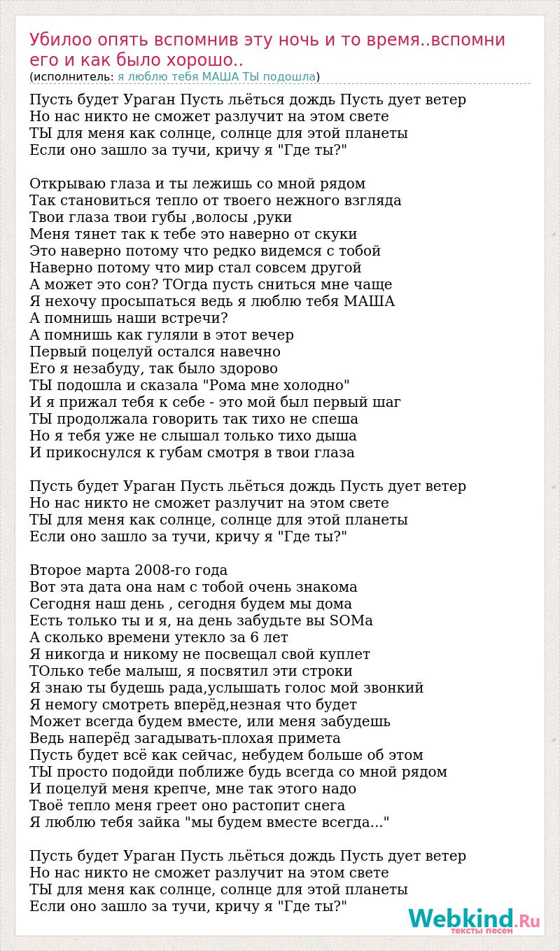 Пусть будет Ураган Пусть льёться дождь Пусть дует ветер Но нас никто не сможет разлучит на этом свете ТЫ для меня как солнце, солнце для этой планеты Если оно зашло за тучи, кричу я "Где ты?" Открываю глаза и ты лежишь со мной рядом Так становиться тепло от твоего нежного взгляда Твои глаза твои губы ,волосы ,руки Меня тянет так к тебе это наверно от скуки Это наверно потому что редко видемся с тобой Наверно потому что мир стал совсем другой А может это сон? ТОгда пусть сниться мне чаще Я нехочу просыпаться ведь я люблю тебя МАША А помнишь наши встречи? А помнишь как гуляли в этот вечер Первый поцелуй остался навечно Его я незабуду, так было здорово ТЫ подошла и сказала "Рома мне холодно" И я прижал тебя к себе - это мой был первый шаг ТЫ продолжала говорить так тихо не спеша Но я тебя уже не слышал только тихо дыша И прикоснулся к губам смотря в твои глаза Пусть будет Ураган Пусть льёться дождь Пусть дует ветер Но нас никто не сможет разлучит на этом свете ТЫ для меня как солнце, солнце для этой планеты Если оно зашло за тучи, кричу я "Где ты?" Второе марта 2008-го года Вот эта дата она нам с тобой очень знакома Сегодня наш день , сегодня будем мы дома Есть только ты и я, на день забудьте вы SOMa А сколько времени утекло за 6 лет Я никогда и никому не посвещал свой куплет ТОлько тебе малыш, я посвятил эти строки Я знаю ты будешь рада,услышать голос мой звонкий Я немогу смотреть вперёд,незная что будет Может всегда будем вместе, или меня забудешь Ведь наперёд загадывать-плохая примета Пусть будет всё как сейчас, небудем больше об этом ТЫ просто подойди поближе будь всегда со мной рядом И поцелуй меня крепче, мне так этого надо Твоё тепло меня греет оно растопит снега Я люблю тебя зайка "мы будем вместе всегда..." Пусть будет Ураган Пусть льёться дождь Пусть дует ветер Но нас никто не сможет разлучит на этом свете ТЫ для меня как солнце, солнце для этой планеты Если оно зашло за тучи, кричу я "Где ты?"