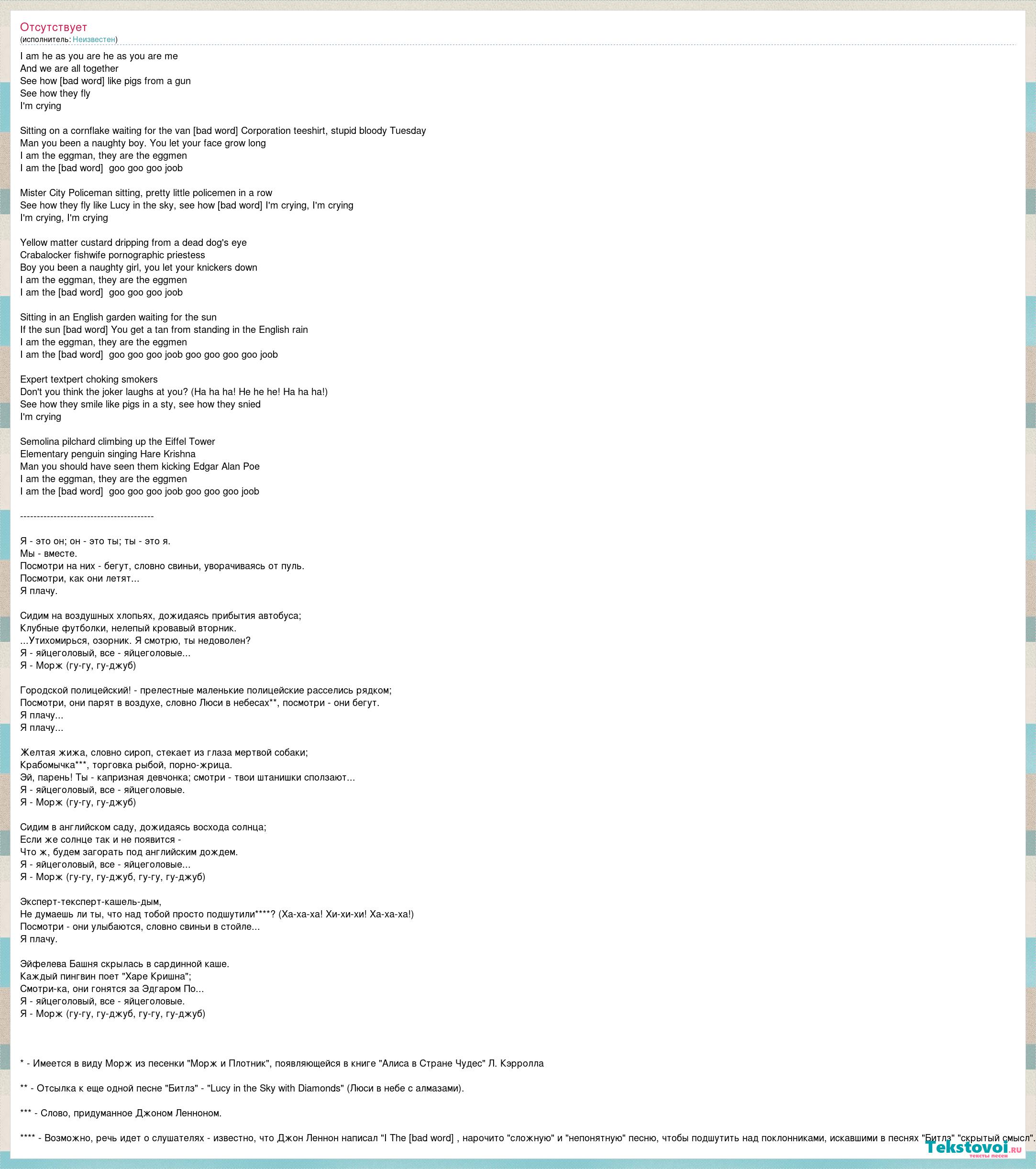 I am he as you are he as you are me And we are all together See how they run like pigs from a gun See how they fly I'm crying Sitting on a cornflake waiting for the van to come Corporation teeshirt, stupid bloody Tuesday Man you been a naughty boy. You let your face grow long I am the eggman, they are the eggmen I am the walrus, goo goo goo joob Mister City Policeman sitting, pretty little policemen in a row See how they fly like Lucy in the sky, see how they run I'm crying, I'm crying I'm crying, I'm crying Yellow matter custard dripping from a dead dog's eye Crabalocker fishwife pornographic priestess Boy you been a naughty girl, you let your knickers down I am the eggman, they are the eggmen I am the walrus, goo goo goo joob Sitting in an English garden waiting for the sun If the sun don't come You get a tan from standing in the English rain I am the eggman, they are the eggmen I am the walrus, goo goo goo joob goo goo goo goo joob Expert textpert choking smokers Don't you think the joker laughs at you? (Ha ha ha! He he he! Ha ha ha!) See how they smile like pigs in a sty, see how they snied I'm crying Semolina pilchard climbing up the Eiffel Tower Elementary penguin singing Hare Krishna Man you should have seen them kicking Edgar Alan Poe I am the eggman, they are the eggmen I am the walrus, goo goo goo joob goo goo goo joob ---------------------------------------- Я - это он; он - это ты; ты - это я. Мы - вместе. Посмотри на них - бегут, словно свиньи, уворачиваясь от пуль. Посмотри, как они летят... Я плачу. Сидим на воздушных хлопьях, дожидаясь прибытия автобуса; Клубные футболки, нелепый кровавый вторник. ...Утихомирься, озорник. Я смотрю, ты недоволен? Я - яйцеголовый, все - яйцеголовые... Я - Морж (гу-гу, гу-джуб) Городской полицейский! - прелестные маленькие полицейские расселись рядком; Посмотри, они парят в воздухе, словно Люси в небесах**, посмотри - они бегут. Я плачу... Я плачу... Желтая жижа, словно сироп, стекает из глаза мертвой собаки; Крабомычка***, торговка рыбой, порно-жрица. Эй, парень! Ты - капризная девчонка; смотри - твои штанишки сползают... Я - яйцеголовый, все - яйцеголовые. Я - Морж (гу-гу, гу-джуб) Сидим в английском саду, дожидаясь восхода солнца; Если же солнце так и не появится - Что ж, будем загорать под английским дождем. Я - яйцеголовый, все - яйцеголовые... Я - Морж (гу-гу, гу-джуб, гу-гу, гу-джуб) Эксперт-тексперт-кашель-дым, Не думаешь ли ты, что над тобой просто подшутили****? (Ха-ха-ха! Хи-хи-хи! Ха-ха-ха!) Посмотри - они улыбаются, словно свиньи в стойле... Я плачу. Эйфелева Башня скрылась в сардинной каше. Каждый пингвин поет "Харе Кришна"; Смотри-ка, они гонятся за Эдгаром По... Я - яйцеголовый, все - яйцеголовые. Я - Морж (гу-гу, гу-джуб, гу-гу, гу-джуб) * - Имеется в виду Морж из песенки "Морж и Плотник", появляющейся в книге "Алиса в Стране Чудес" Л. Кэрролла ** - Отсылка к еще одной песне "Битлз" - "Lucy in the Sky with Diamonds" (Люси в небе с алмазами). *** - Слово, придуманное Джоном Ленноном. **** - Возможно, речь идет о слушателях - известно, что Джон Леннон написал "I The Walrus", нарочито "сложную" и "непонятную" песню, чтобы подшутить над поклонниками, искавшими в песнях "Битлз" "скрытый смысл".