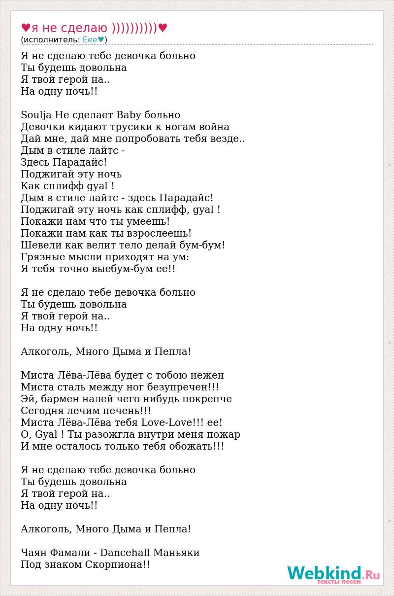 Я не сделаю тебе девочка больно Ты будешь довольна Я твой герой на.. На одну ночь!! Soulja Не сделает Baby больно Девочки кидают трусики к ногам война Дай мне, дай мне попробовать тебя везде.. Дым в стиле лайтс - Здесь Парадайс! Поджигай эту ночь Как сплифф gyal ! Дым в стиле лайтс - здесь Парадайс! Поджигай эту ночь как сплифф, gyal ! Покажи нам что ты умеешь! Покажи нам как ты взрослеешь! Шевели как велит тело делай бум-бум! Грязные мысли приходят на ум: Я тебя точно выебум-бум ее!! Я не сделаю тебе девочка больно Ты будешь довольна Я твой герой на.. На одну ночь!! Алкоголь, Много Дыма и Пепла! Миста Лёва-Лёва будет с тобою нежен Миста сталь между ног безупречен!!! Эй, бармен налей чего нибудь покрепче Сегодня лечим печень!!! Миста Лёва-Лёва тебя Love-Love!!! ее! O, Gyal ! Ты разожгла внутри меня пожар И мне осталось только тебя обожать!!! Я не сделаю тебе девочка больно Ты будешь довольна Я твой герой на.. На одну ночь!! Алкоголь, Много Дыма и Пепла! Чаян Фамали - Dancehall Маньяки Под знаком Скорпиона!!