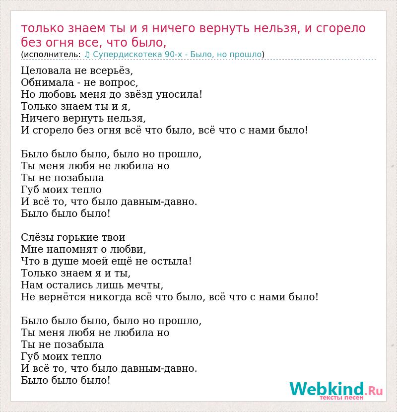 Целовала не всерьёз, Обнимала - не вопрос, Но любовь меня до звёзд уносила! Только знаем ты и я, Ничего вернуть нельзя, И сгорело без огня всё что было, всё что с нами было! Было было было, было но прошло, Ты меня любя не любила но Ты не позабыла Губ моих тепло И всё то, что было давным-давно. Было было было! Слёзы горькие твои Мне напомнят о любви, Что в душе моей ещё не остыла! Только знаем я и ты, Нам остались лишь мечты, Не вернётся никогда всё что было, всё что с нами было! Было было было, было но прошло, Ты меня любя не любила но Ты не позабыла Губ моих тепло И всё то, что было давным-давно. Было было было!