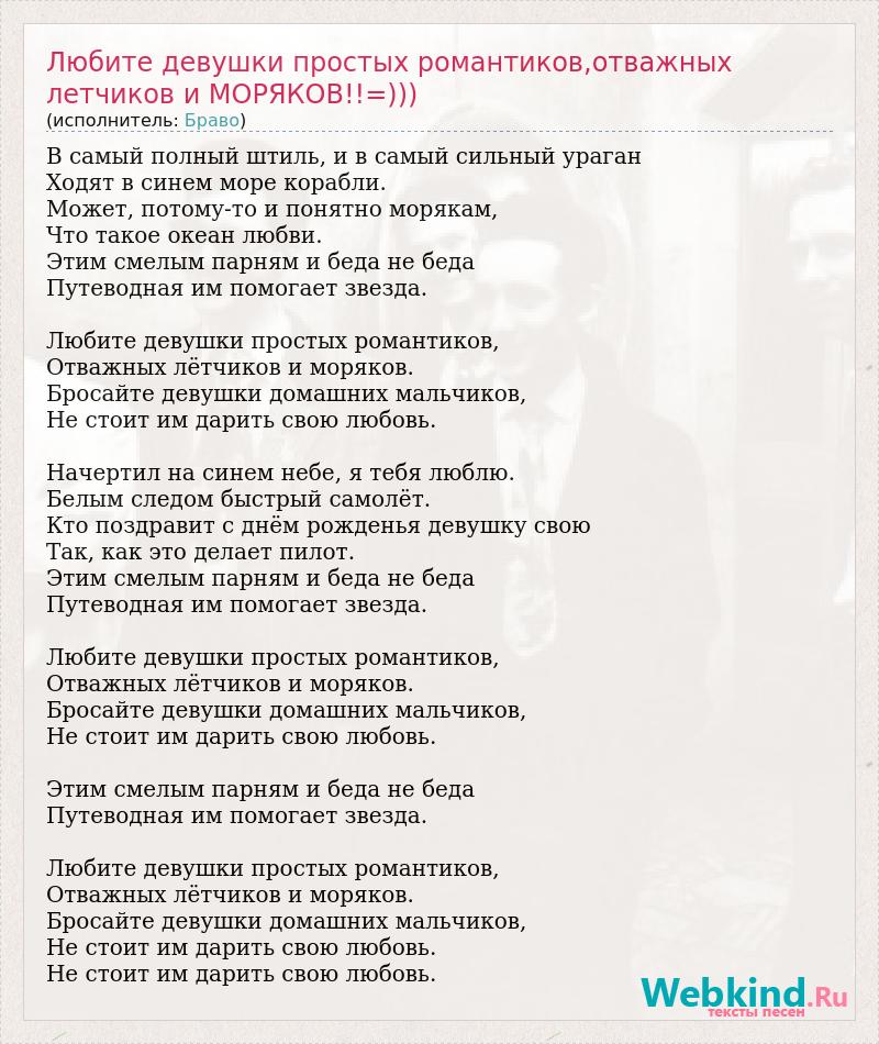 В самый полный штиль, и в самый сильный ураган Ходят в синем море корабли. Может, потому-то и понятно морякам, Что такое океан любви. Этим смелым парням и беда не беда Путеводная им помогает звезда. Любите девушки простых романтиков, Отважных лётчиков и моряков. Бросайте девушки домашних мальчиков, Не стоит им дарить свою любовь. Начертил на синем небе, я тебя люблю. Белым следом быстрый самолёт. Кто поздравит с днём рожденья девушку свою Так, как это делает пилот. Этим смелым парням и беда не беда Путеводная им помогает звезда. Любите девушки простых романтиков, Отважных лётчиков и моряков. Бросайте девушки домашних мальчиков, Не стоит им дарить свою любовь. Этим смелым парням и беда не беда Путеводная им помогает звезда. Любите девушки простых романтиков, Отважных лётчиков и моряков. Бросайте девушки домашних мальчиков, Не стоит им дарить свою любовь. Не стоит им дарить свою любовь.