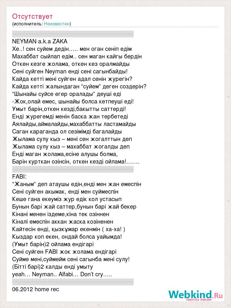 ░░░░░░░░░░░░░░░░░░░░░░░░░░░░░░ NEYMAN a.k.a ZAKA Хе..! сен суйем дедін….. мен оган сеніп едім Махаббат сыйлап едім.. сен маган кайгы бердін Откен кезге жолама, откен кез оралмайды Сені суйген Neyman енді сені сагынбайды! Кайда кетті мені суйген адал сенін журегін? Кайда кетті жалындаган “суйем” деген создерін? “Шынайы суйсе егер оралады” деуші еді -Жок,олай емес, шынайы болса кетпеуші еді! Умыт барін,откен кезді,бакытты саттерді! Енді журегемді менін баска жан тербетеді Аялайды,аймалайды,махаббатты ластамайды Саган караганда ол сезімімді багалайды Жылама сулу кыз – мені сен жогалттын деп Жылама сулу кыз – махаббат жогалды деп Енді маган жолама,есіне алушы болма, Барін курткан озінсін, откен кезді ойлама!……. ░░░░░░░░░░░░░░░░░░░░░░░░░░░░░░ FABI: “Жаным” деп атаушы едін,енді мен жан емеспін Сені суйген акымак, енді мен суймеспін Кеше гана екеуміз жур едік кол устасып Бунын барі жай саттер,бунын барі жай бекер Кінані менен іздеме,кіна тек озіннен Кіналі емеспін аккан жаска козіненен Кайтесін енді, қызкұмар екенмін ( ха-ха! ) Кыздар коп екен, ондай болса уайымда! (Умыт барін)2 ойлама ендігарі Сені суйген FABI жок жолама ендігарі Суйме мені,суймейм сені сагынба мені сулу! (Бітті барі)2 калды енді умыту yeah… Neyman.. Alfabi… Don’t cry….. ░░░░░░░░░░░░░░░░░░░░░░░░░░░░░░ 06.2012 home rec