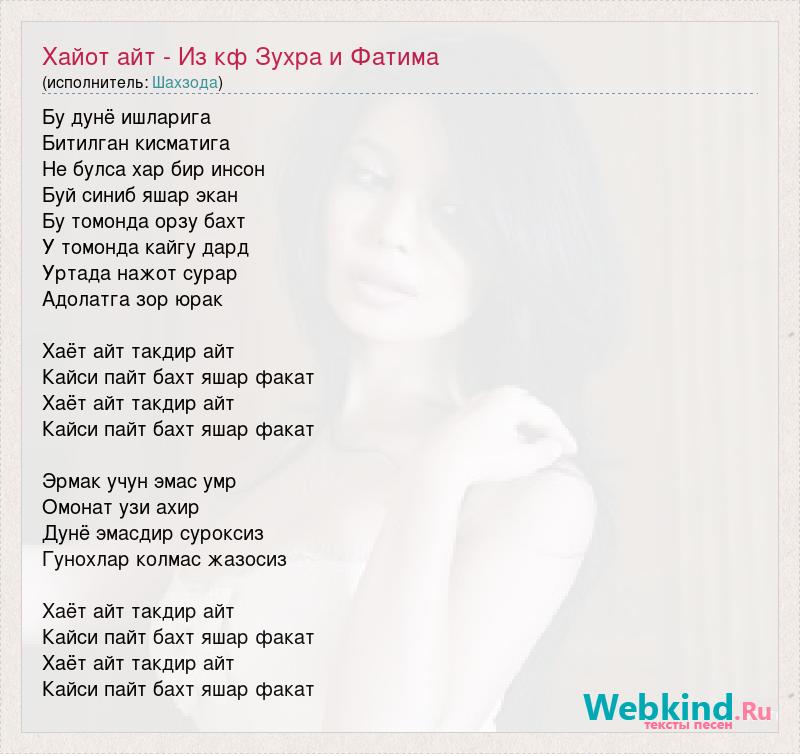 Бу дунё ишларига Битилган кисматига Не булса хар бир инсон Буй синиб яшар экан Бу томонда орзу бахт У томонда кайгу дард Уртада нажот сурар Адолатга зор юрак Хаёт айт такдир айт Кайси пайт бахт яшар факат Хаёт айт такдир айт Кайси пайт бахт яшар факат Эрмак учун эмас умр Омонат узи ахир Дунё эмасдир суроксиз Гунохлар колмас жазосиз Хаёт айт такдир айт Кайси пайт бахт яшар факат Хаёт айт такдир айт Кайси пайт бахт яшар факат