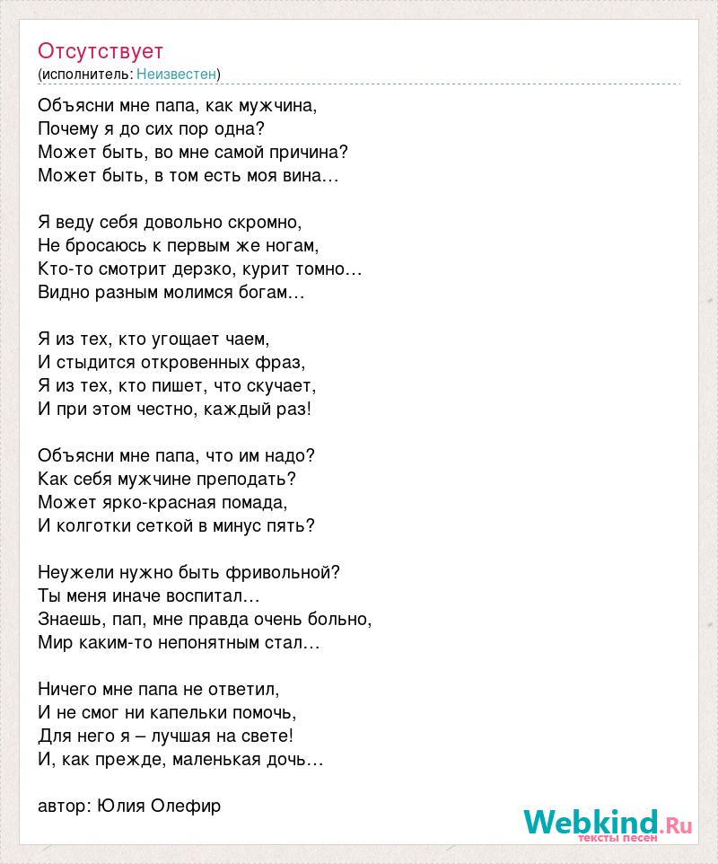 Объясни мне папа, как мужчина, Почему я до сих пор одна? Может быть, во мне самой причина? Может быть, в том есть моя вина… Я веду себя довольно скромно, Не бросаюсь к первым же ногам, Кто-то смотрит дерзко, курит томно… Видно разным молимся богам… Я из тех, кто угощает чаем, И стыдится откровенных фраз, Я из тех, кто пишет, что скучает, И при этом честно, каждый раз! Объясни мне папа, что им надо? Как себя мужчине преподать? Может ярко-красная помада, И колготки сеткой в минус пять? Неужели нужно быть фривольной? Ты меня иначе воспитал… Знаешь, пап, мне правда очень больно, Мир каким-то непонятным стал… Ничего мне папа не ответил, И не смог ни капельки помочь, Для него я – лучшая на свете! И, как прежде, маленькая дочь… автор: Юлия Олефир