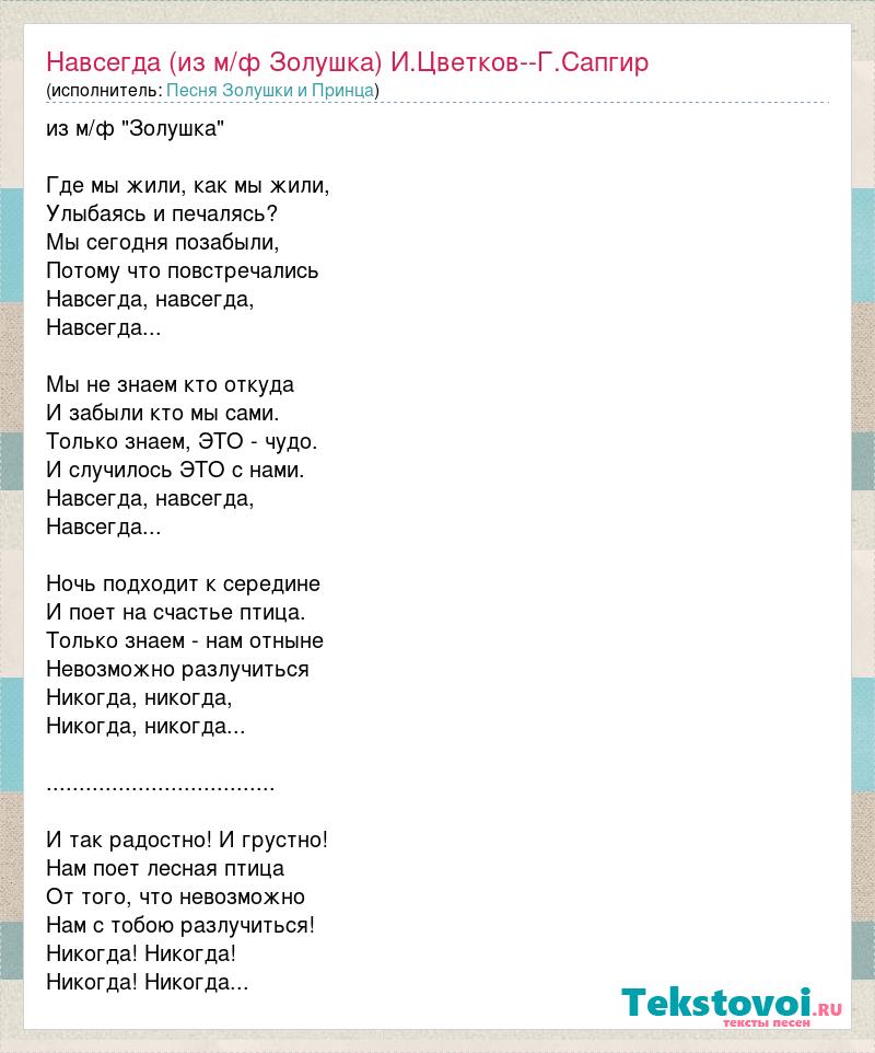 из м/ф "Золушка" Где мы жили, как мы жили, Улыбаясь и печалясь? Мы сегодня позабыли, Потому что повстречались Навсегда, навсегда, Навсегда... Мы не знаем кто откуда И забыли кто мы сами. Только знаем, ЭТО - чудо. И случилось ЭТО с нами. Навсегда, навсегда, Навсегда... Ночь подходит к середине И поет на счастье птица. Только знаем - нам отныне Невозможно разлучиться Никогда, никогда, Никогда, никогда... ................................... И так радостно! И грустно! Нам поет лесная птица От того, что невозможно Нам с тобою разлучиться! Никогда! Никогда! Никогда! Никогда...