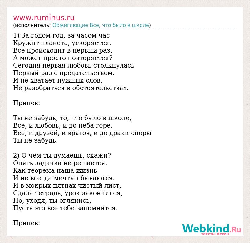 1) За годом год, за часом час Кружит планета, ускоряется. Все происходит в первый раз, А может просто повторяется? Сегодня первая любовь столкнулась Первый раз с предательством. И не хватает нужных слов, Не разобраться в обстоятельствах. Припев: Ты не забудь, то, что было в школе, Все, и любовь, и до неба горе. Все, и друзей, и врагов, и до драки споры Ты не забудь. 2) О чем ты думаешь, скажи? Опять задачка не решается. Как теорема наша жизнь И не всегда мечты сбываются. И в мокрых пятнах чистый лист, Сдала тетрадь, урок закончился, Но, уходя, ты оглянись, Пусть это все тебе запомнится. Припев: