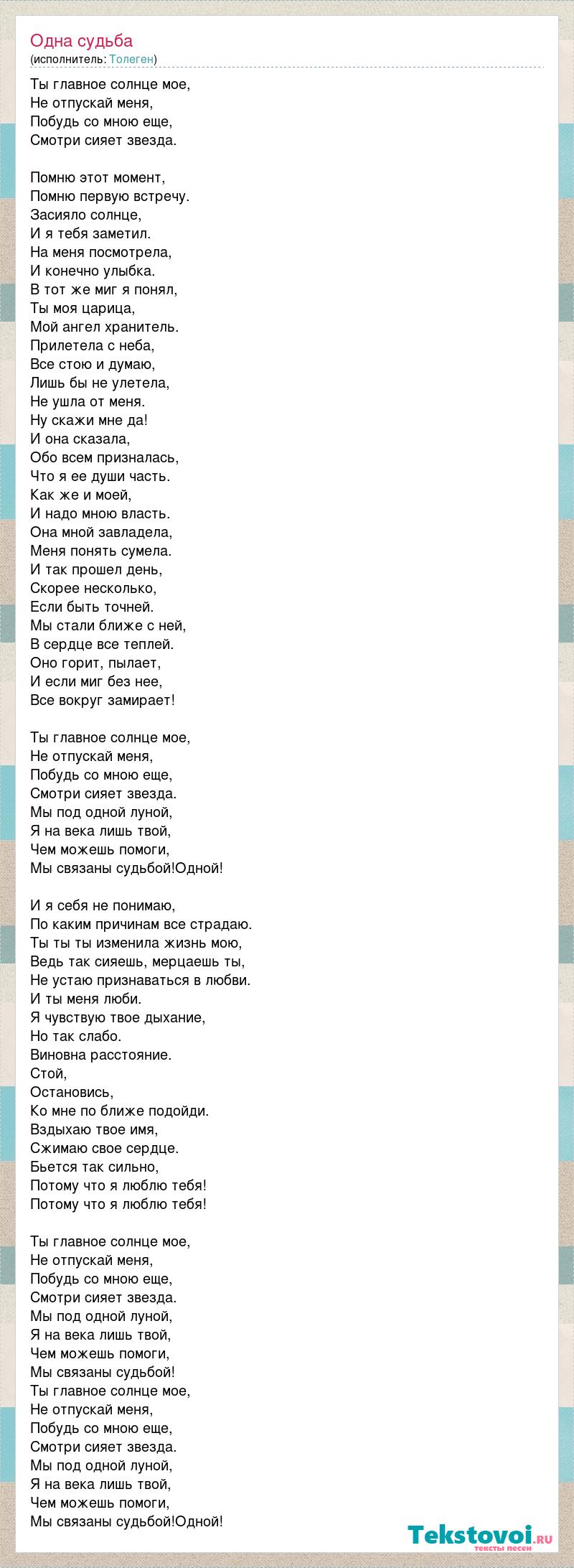Ты главное солнце мое, Не отпускай меня, Побудь со мною еще, Смотри сияет звезда. Помню этот момент, Помню первую встречу. Засияло солнце, И я тебя заметил. На меня посмотрела, И конечно улыбка. В тот же миг я понял, Ты моя царица, Мой ангел хранитель. Прилетела с неба, Все стою и думаю, Лишь бы не улетела, Не ушла от меня. Ну скажи мне да! И она сказала, Обо всем призналась, Что я ее души часть. Как же и моей, И надо мною власть. Она мной завладела, Меня понять сумела. И так прошел день, Скорее несколько, Если быть точней. Мы стали ближе с ней, В сердце все теплей. Оно горит, пылает, И если миг без нее, Все вокруг замирает! Ты главное солнце мое, Не отпускай меня, Побудь со мною еще, Смотри сияет звезда. Мы под одной луной, Я на века лишь твой, Чем можешь помоги, Мы связаны судьбой!Одной! И я себя не понимаю, По каким причинам все страдаю. Ты ты ты изменила жизнь мою, Ведь так сияешь, мерцаешь ты, Не устаю признаваться в любви. И ты меня люби. Я чувствую твое дыхание, Но так слабо. Виновна расстояние. Стой, Остановись, Ко мне по ближе подойди. Вздыхаю твое имя, Сжимаю свое сердце. Бьется так сильно, Потому что я люблю тебя! Потому что я люблю тебя! Ты главное солнце мое, Не отпускай меня, Побудь со мною еще, Смотри сияет звезда. Мы под одной луной, Я на века лишь твой, Чем можешь помоги, Мы связаны судьбой! Ты главное солнце мое, Не отпускай меня, Побудь со мною еще, Смотри сияет звезда. Мы под одной луной, Я на века лишь твой, Чем можешь помоги, Мы связаны судьбой!Одной!