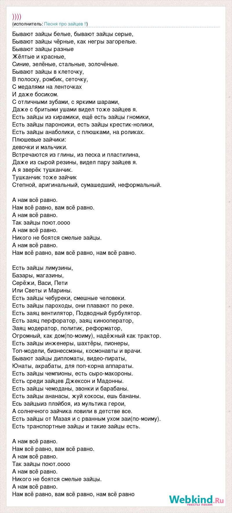 Бывают зайцы белые, бывают зайцы серые, Бывают зайцы чёрные, как негры загорелые. Бывают зайцы разные Жёлтые и красные, Синие, зелёные, стальные, золочёные. Бывают зайцы в клеточку, В полоску, ромбик, сеточку, С медалями на ленточках И даже босиком. С отличными зубами, с яркими шарами, Даже с бритыми ушами видел тоже зайцев я. Есть зайцы из кирамики, ещё есть зайцы гномики, Есть зайцы пароноики, есть зайцы крестик-нолики, Есть зайцы анаболики, с плюшками, на роликах. Плюшевые зайчики: девочки и мальчики. Встречаются из глины, из песка и пластилина, Даже из сырой резины, видел пару зайцев я. А я зверёк тушканчик. Тушканчик тоже зайчик Степной, аригинальный, сумашедший, неформальный. А нам всё равно. Нам всё равно, вам всё равно. А нам всё равно. Так зайцы поют.оооо А нам всё равно. Никого не боятся смелые зайцы. А нам всё равно. Нам всё равно, вам всё равно, нам всё равно. Есть зайцы лимузины, Базары, магазины, Серёжи, Васи, Пети Или Светы и Марины. Есть зайцы чебуреки, смешные человеки. Есть зайцы пароходы, они плавают по реке. Есть заяц вентилятор, Подводный бурбулятор. Есть заяц перфоратор, заяц кинооператор, Заяц модератор, политик, реформатор, Огромный, как дом(по-моиму), надёжный как трактор. Есть зайцы инженеры, шахтёры, пионеры, Топ-модели, бизнессмэны, космонавты и врачи. Бывают зайцы дипломаты, видео-пираты, Юнаты, акрабаты, для поп-корна аппараты. Есть зайцы чемпионы, есть сыро-макороны. Есть среди зайцев Джексон и Мадонны. Есть зайцы чемоданы, звонки и барабаны. Есть зайцы ананасы, жуй кокосы, ешь бананы. Есь зайцыиз плэйбоя, из мультика герои, А солнечного зайчика ловили в детстве все. Есть зайцы от Мазая и с рванным ухом заи(по-моиму). Есть транспортные зайцы и такие зайцы есть. А нам всё равно. Нам всё равно, вам всё равно. А нам всё равно. Так зайцы поют.оооо А нам всё равно. Никого не боятся смелые зайцы. А нам всё равно. Нам всё равно, вам всё равно, нам всё равно