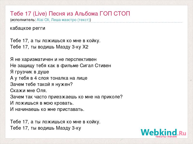 кабацкое регги Тебе 17, а ты ложишься ко мне в койку. Тебе 17, ты водишь Мазду 3-ку Х2 Я не харизматичен и не перспективен Не защищу тебя как в фильме Сигал Стивен Я грузчик в душе А у тебя в 4 слоя тоналка на лице Зачем тебе такой я нужен? Скажи мне Оля. Зачем так часто приезжаешь ко мне на приколе? И ложишься в мою кровать. И начинаешь ко мне приставать. Тебе 17, а ты ложишься ко мне в койку. Тебе 17, ты водишь Мазду 3-ку