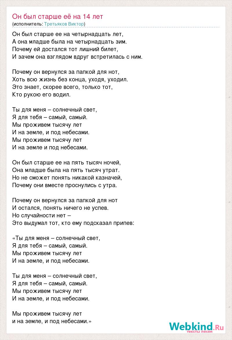 Он был старше ее на четырнадцать лет, А она младше была на четырнадцать зим. Почему ей достался тот лишний билет, И зачем она взглядом вдруг встретилась с ним. Почему он вернулся за папкой для нот, Хоть всю жизнь без конца, уходя, уходил. Это знает, скорее всего, только тот, Кто рукою его водил. Ты для меня – солнечный свет, Я для тебя – самый, самый. Мы проживем тысячу лет И на земле, и под небесами. Мы проживем тысячу лет И на земле и под небесами. Он был старше ее на пять тысяч ночей, Она младше была на пять тысяч утрат. Но не сможет понять никакой казначей, Почему они вместе проснулись с утра. Почему он вернулся за папкой для нот И остался, понять ничего не успев. Но случайности нет – Это выдумал тот, кто ему подсказал припев: «Ты для меня – солнечный свет, Я для тебя – самый, самый. Мы проживем тысячу лет И на земле, и под небесами. Ты для меня – солнечный свет, Я для тебя – самый, самый. Мы проживем тысячу лет И на земле, и под небесами. Мы проживем тысячу лет и на земле, и под небесами.»