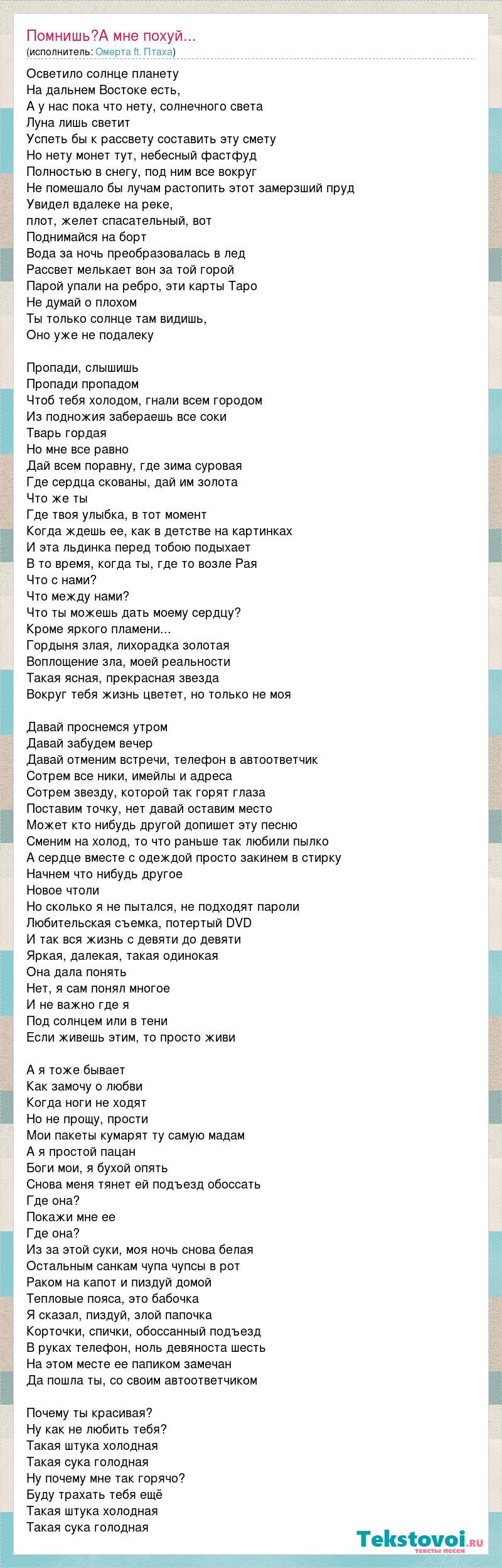 Осветило солнце планету На дальнем Востоке есть, А у нас пока что нету, солнечного света Луна лишь светит Успеть бы к рассвету составить эту смету Но нету монет тут, небесный фастфуд Полностью в снегу, под ним все вокруг Не помешало бы лучам растопить этот замерзший пруд Увидел вдалеке на реке, плот, желет спасательный, вот Поднимайся на борт Вода за ночь преобразовалась в лед Рассвет мелькает вон за той горой Парой упали на ребро, эти карты Таро Не думай о плохом Ты только солнце там видишь, Оно уже не подалеку Пропади, слышишь Пропади пропадом Чтоб тебя холодом, гнали всем городом Из подножия забераешь все соки Тварь гордая Но мне все равно Дай всем поравну, где зима суровая Где сердца скованы, дай им золота Что же ты Где твоя улыбка, в тот момент Когда ждешь ее, как в детстве на картинках И эта льдинка перед тобою подыхает В то время, когда ты, где то возле Рая Что с нами? Что между нами? Что ты можешь дать моему сердцу? Кроме яркого пламени... Гордыня злая, лихорадка золотая Воплощение зла, моей реальности Такая ясная, прекрасная звезда Вокруг тебя жизнь цветет, но только не моя Давай проснемся утром Давай забудем вечер Давай отменим встречи, телефон в автоответчик Сотрем все ники, имейлы и адреса Сотрем звезду, которой так горят глаза Поставим точку, нет давай оставим место Может кто нибудь другой допишет эту песню Сменим на холод, то что раньше так любили пылко А сердце вместе с одеждой просто закинем в стирку Начнем что нибудь другое Новое чтоли Но сколько я не пытался, не подходят пароли Любительская съемка, потертый DVD И так вся жизнь с девяти до девяти Яркая, далекая, такая одинокая Она дала понять Нет, я сам понял многое И не важно где я Под солнцем или в тени Если живешь этим, то просто живи А я тоже бывает Как замочу о любви Когда ноги не ходят Но не прощу, прости Мои пакеты кумарят ту самую мадам А я простой пацан Боги мои, я бухой опять Снова меня тянет ей подъезд обоссать Где она? Покажи мне ее Где она? Из за этой суки, моя ночь снова белая Остальным санкам чупа чупсы в рот Раком на капот и пиздуй домой Тепловые пояса, это бабочка Я сказал, пиздуй, злой папочка Корточки, спички, обоссанный подъезд В руках телефон, ноль девяноста шесть На этом месте ее папиком замечан Да пошла ты, со своим автоответчиком Почему ты красивая? Ну как не любить тебя? Такая штука холодная Такая сука голодная Ну почему мне так горячо? Буду трахать тебя ещё Такая штука холодная Такая сука голодная