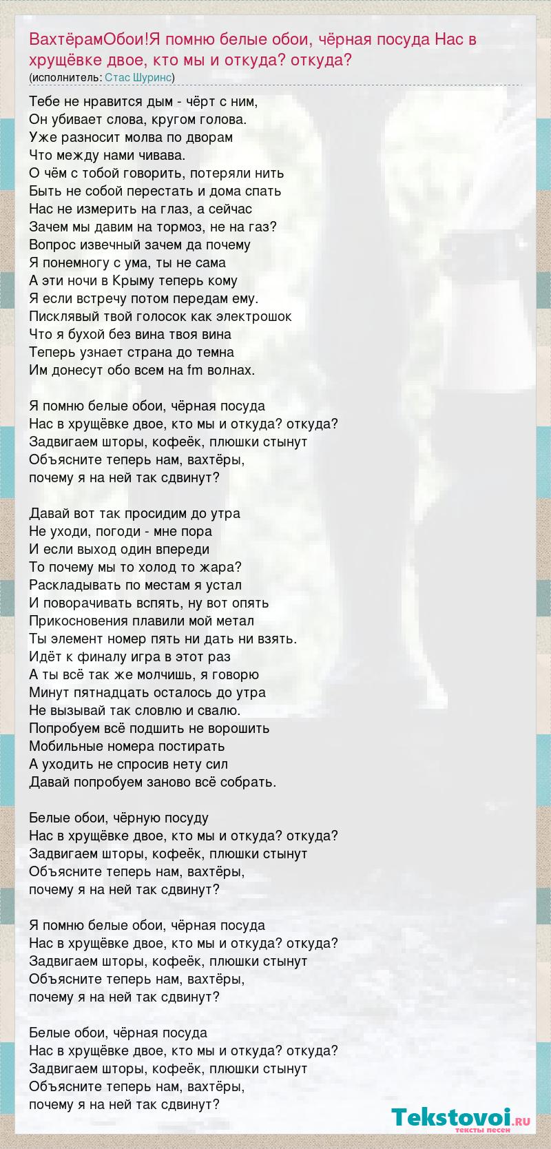 Тебе не нравится дым - чёрт с ним, Он убивает слова, кругом голова. Уже разносит молва по дворам Что между нами чивава. О чём с тобой говорить, потеряли нить Быть не собой перестать и дома спать Нас не измерить на глаз, а сейчас Зачем мы давим на тормоз, не на газ? Вопрос извечный зачем да почему Я понемногу с ума, ты не сама А эти ночи в Крыму теперь кому Я если встречу потом передам ему. Писклявый твой голосок как электрошок Что я бухой без вина твоя вина Теперь узнает страна до темна Им донесут обо всем на fm волнах. Я помню белые обои, чёрная посуда Нас в хрущёвке двое, кто мы и откуда? откуда? Задвигаем шторы, кофеёк, плюшки стынут Объясните теперь нам, вахтёры, почему я на ней так сдвинут? Давай вот так просидим до утра Не уходи, погоди - мне пора И если выход один впереди То почему мы то холод то жара? Раскладывать по местам я устал И поворачивать вспять, ну вот опять Прикосновения плавили мой метал Ты элемент номер пять ни дать ни взять. Идёт к финалу игра в этот раз А ты всё так же молчишь, я говорю Минут пятнадцать осталось до утра Не вызывай так словлю и свалю. Попробуем всё подшить не ворошить Мобильные номера постирать А уходить не спросив нету сил Давай попробуем заново всё собрать. Белые обои, чёрную посуду Нас в хрущёвке двое, кто мы и откуда? откуда? Задвигаем шторы, кофеёк, плюшки стынут Объясните теперь нам, вахтёры, почему я на ней так сдвинут? Я помню белые обои, чёрная посуда Нас в хрущёвке двое, кто мы и откуда? откуда? Задвигаем шторы, кофеёк, плюшки стынут Объясните теперь нам, вахтёры, почему я на ней так сдвинут? Белые обои, чёрная посуда Нас в хрущёвке двое, кто мы и откуда? откуда? Задвигаем шторы, кофеёк, плюшки стынут Объясните теперь нам, вахтёры, почему я на ней так сдвинут?