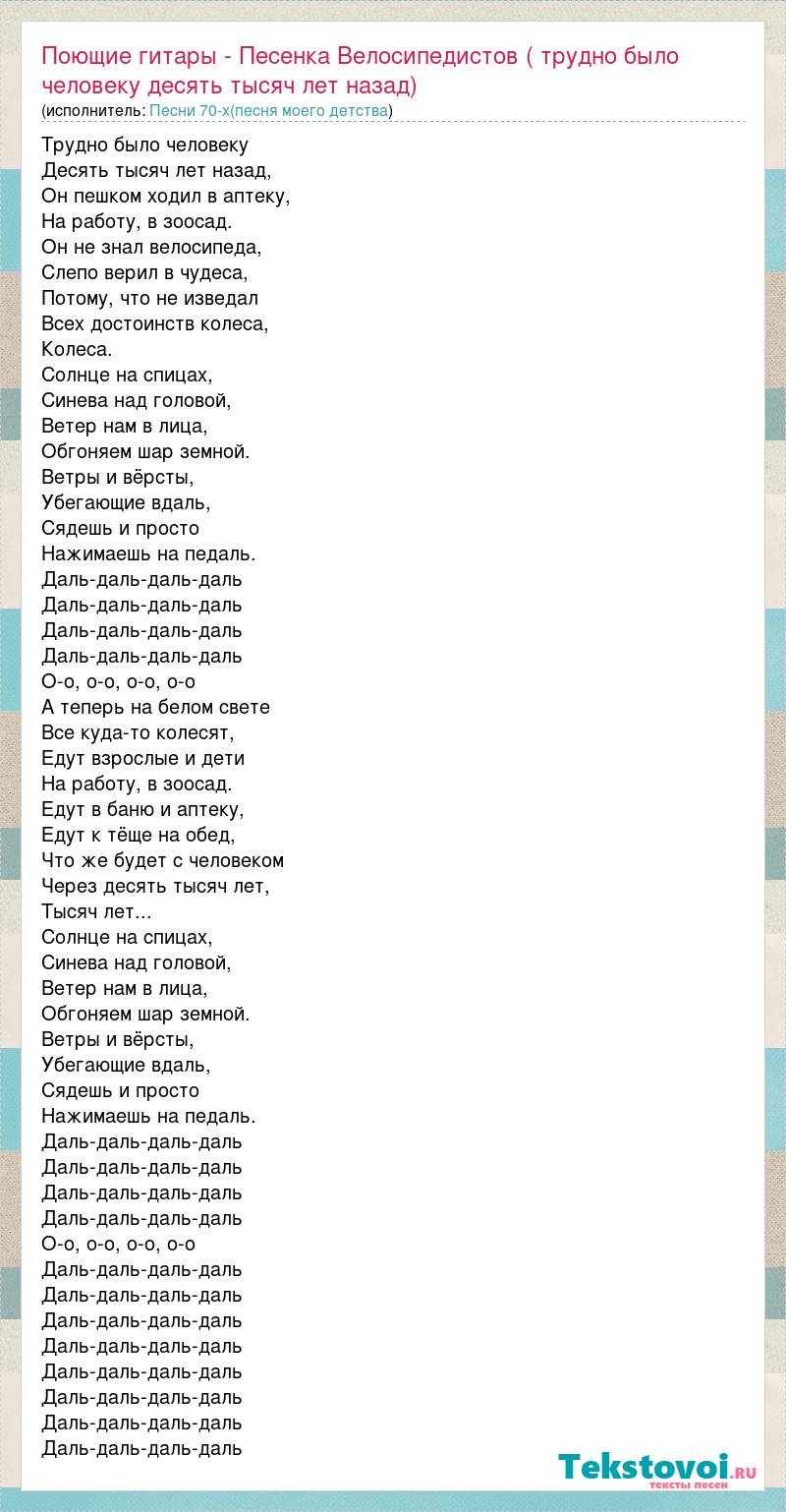 Трудно было человеку Десять тысяч лет назад, Он пешком ходил в аптеку, На работу, в зоосад. Он не знал велосипеда, Слепо верил в чудеса, Потому, что не изведал Всех достоинств колеса, Колеса. Солнце на спицах, Синева над головой, Ветер нам в лица, Обгоняем шар земной. Ветры и вёрсты, Убегающие вдаль, Сядешь и просто Нажимаешь на педаль. Даль-даль-даль-даль Даль-даль-даль-даль Даль-даль-даль-даль Даль-даль-даль-даль О-о, о-о, о-о, о-о А теперь на белом свете Все куда-то колесят, Едут взрослые и дети На работу, в зоосад. Едут в баню и аптеку, Едут к тёще на обед, Что же будет с человеком Через десять тысяч лет, Тысяч лет... Солнце на спицах, Синева над головой, Ветер нам в лица, Обгоняем шар земной. Ветры и вёрсты, Убегающие вдаль, Сядешь и просто Нажимаешь на педаль. Даль-даль-даль-даль Даль-даль-даль-даль Даль-даль-даль-даль Даль-даль-даль-даль О-о, о-о, о-о, о-о Даль-даль-даль-даль Даль-даль-даль-даль Даль-даль-даль-даль Даль-даль-даль-даль Даль-даль-даль-даль Даль-даль-даль-даль Даль-даль-даль-даль Даль-даль-даль-даль