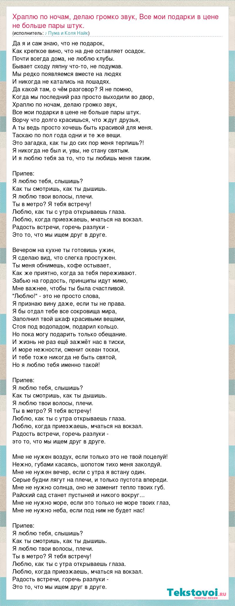 Да я и сам знаю, что не подарок, Как крепкое вино, что на дне оставляет осадок. Почти всегда дома, не люблю клубы. Бывает сходу ляпну что-то, не подумав. Мы редко появляемся вместе на людях И никогда не катались на лошадях. Да какой там, о чём разговор? Я не помню, Когда мы последний раз просто выходили во двор, Храплю по ночам, делаю громко звук, Все мои подарки в цене не больше пары штук. Ворчу что долго красишься, что ждут друзья, А ты ведь просто хочешь быть красивой для меня. Таскаю по пол года одни и те же вещи. Это загадка, как ты до сих пор меня терпишь?! Я никогда не был и, увы, не стану святым. И я люблю тебя за то, что ты любишь меня таким. Припев: Я люблю тебя, слышишь? Как ты смотришь, как ты дышишь. Я люблю твои волосы, плечи. Ты в метро? Я тебя встречу! Люблю, как ты с утра открываешь глаза. Люблю, когда приезжаешь, мчаться на вокзал. Радость встречи, горечь разлуки - Это то, что мы ищем друг в друге. Вечером на кухне ты готовишь ужин, Я сделаю вид, что слегка простужен. Ты меня обнимешь, кофе остывает, Как же приятно, когда за тебя переживают. Забью на гордость, принципы идут мимо, Мне важнее, чтобы ты была счастливой. "Люблю!" - это не просто слова, Я признаю вину даже, если ты не права. Я бы отдал тебе все сокровища мира, Заполнил твой шкаф красивыми вещами, Стоя под водопадом, подарил кольцо. Но пока могу подарить только обещание. И жизнь не раз ещё зажмёт нас в тиски, И море нежности, сменит океан тоски, И тебе тоже никогда не быть святой, Но я люблю тебя именно такой! Припев: Я люблю тебя, слышишь? Как ты смотришь, как ты дышишь. Я люблю твои волосы, плечи. Ты в метро? Я тебя встречу! Люблю, как ты с утра открываешь глаза. Люблю, когда приезжаешь, мчаться на вокзал. Радость встречи, горечь разлуки - это то, что мы ищем друг в друге. Мне не нужен воздух, если только это не твой поцелуй! Нежно, губами касаясь, шопотом тихо меня заколдуй. Мне не нужен вечер, если с утра я встану один. Серые будни лягут на плечи, и только пустота впереди. Мне не нужно солнца, оно не заменит тепло твоих губ. Райский сад станет пустыней и никого вокруг... Мне не нужно море, если это только не море твоих глаз, Мне не нужно неба, если под ним не будет нас! Припев: Я люблю тебя, слышишь? Как ты смотришь, как ты дышишь. Я люблю твои волосы, плечи. Ты в метро? Я тебя встречу! Люблю, как ты с утра открываешь глаза. Люблю, когда приезжаешь, мчаться на вокзал. Радость встречи, горечь разлуки - Это то, что мы ищем друг в друге.