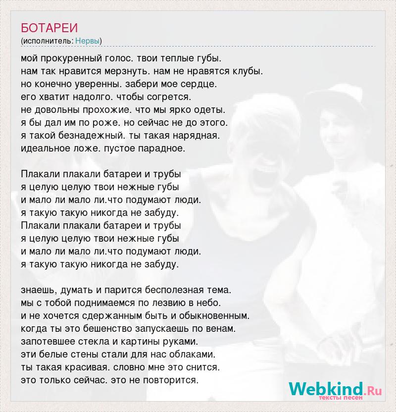 мой прокуренный голос. твои теплые губы. нам так нравится мерзнуть. нам не нравятся клубы. но конечно уверенны. забери мое сердце. его хватит надолго. чтобы согрется. не довольны прохожие. что мы ярко одеты. я бы дал им по роже. но сейчас не до этого. я такой безнадежный. ты такая нарядная. идеальное ложе. пустое парадное. Плакали плакали батареи и трубы я целую целую твои нежные губы и мало ли мало ли.что подумают люди. я такую такую никогда не забуду. Плакали плакали батареи и трубы я целую целую твои нежные губы и мало ли мало ли.что подумают люди. я такую такую никогда не забуду. знаешь, думать и парится бесполезная тема. мы с тобой поднимаемся по лезвию в небо. и не хочется сдержанным быть и обыкновенным. когда ты это бешенство запускаешь по венам. запотевшее стекла и картины руками. эти белые стены стали для нас облаками. ты такая красивая. словно мне это снится. это только сейчас. это не повторится.