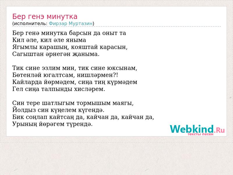 Бер генә минутка барсын да оныт та Кил әле, кил әле яныма Ягымлы карашың, кояштай карасын, Сагыштан әрнегән җаныма. Тик сине эзлим мин, тик сине юксынам, Бөтенләй югалтсам, нишләрмен?! Кайларда йөрмәдем, сиңа тиң күрмәдем Гел сиңа талпынды хисләрем. Син тере шатлыгым тормышым маягы, Йолдыз син күңелем күгендә. Бик соңлап кайтсаң да, кайчан да, кайчан да, Урының йөрәгем түрендә.