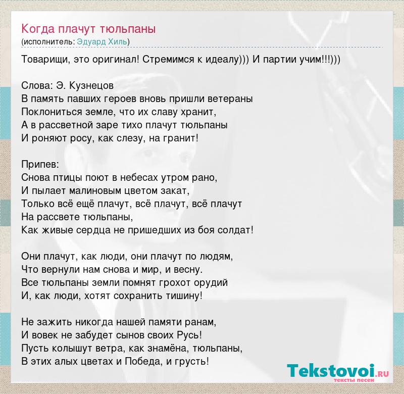 Товарищи, это оригинал! Стремимся к идеалу))) И партии учим!!!))) Слова: Э. Кузнецов В память павших героев вновь пришли ветераны Поклониться земле, что их славу хранит, А в рассветной заре тихо плачут тюльпаны И роняют росу, как слезу, на гранит! Припев: Снова птицы поют в небесах утром рано, И пылает малиновым цветом закат, Только всё ещё плачут, всё плачут, всё плачут На рассвете тюльпаны, Как живые сердца не пришедших из боя солдат! Они плачут, как люди, они плачут по людям, Что вернули нам снова и мир, и весну. Все тюльпаны земли помнят грохот орудий И, как люди, хотят сохранить тишину! Не зажить никогда нашей памяти ранам, И вовек не забудет сынов своих Русь! Пусть колышут ветра, как знамёна, тюльпаны, В этих алых цветах и Победа, и грусть!